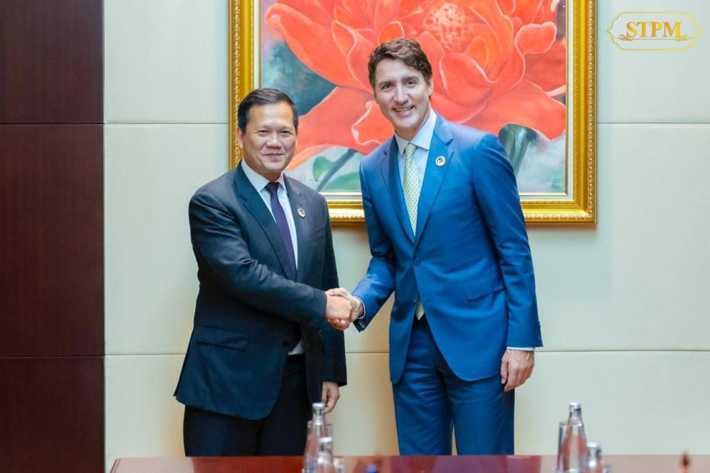 Cambodian Prime Minister Samdech Thipadei Hun Manet (L) meets his Canadian counterpart H.E. Justin Trudeau, in Vientiane on Oct. 10, 2024, on the sidelines of the 44th and 45th ASEAN Summits and Related Summits
