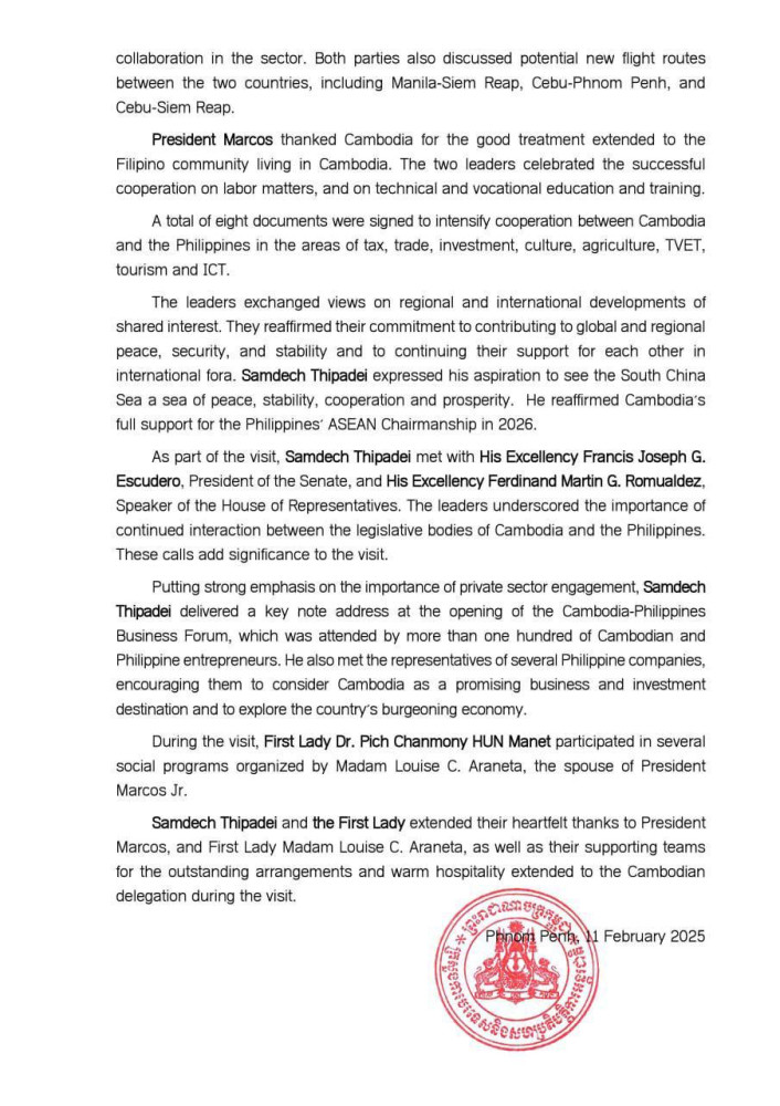 The Cambodian Ministry of Foreign Affairs and International Cooperation this evening made public a press release, highlighting the fruitful outcomes of the two-day official visit of Cambodian Prime Minister Samdech Moha Borvor Thipadei Hun Manet and First Lady, Lok Chumteav Dr. Pich Chanmony to the Philippines.
