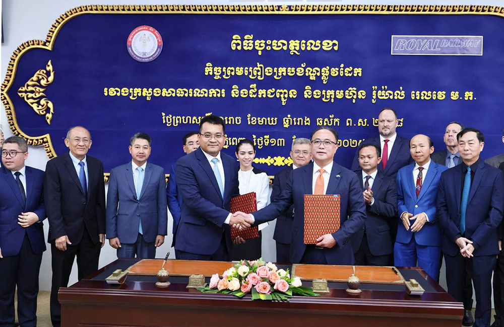 The agreement was signed here on Feb. 13 between H.E. Peng Ponea, Minister of Public Works and Transport, representing the Royal Government of Cambodia, and Neak Oknha Kith Meng, Chairman of the Board of Directors of Royal Railway PLC.