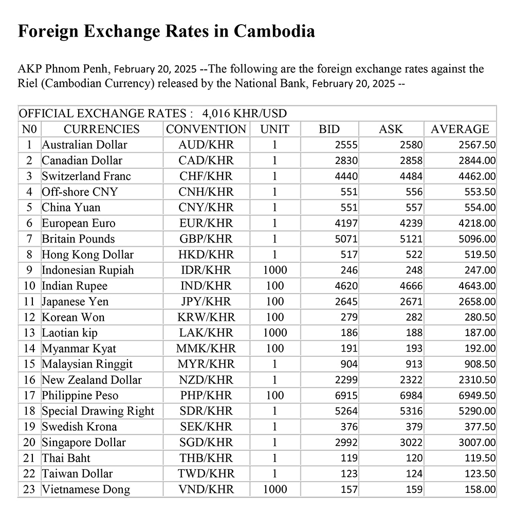 The following are the foreign exchange rates against the Riel (Cambodian Currency) released by the National Bank, February 20, 2025 --