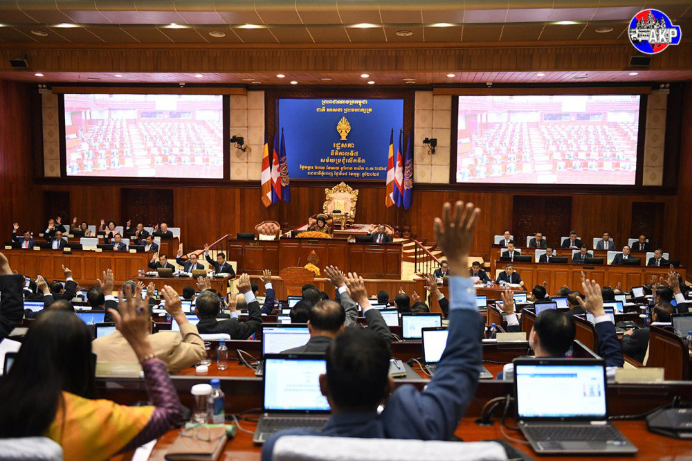 Lawmakers vote for the draft law against non-recognition of the crimes committed during the Democratic Kampuchea period, at the 3rd session of the 7th legislature of the National Assembly on Feb. 18, 2025
