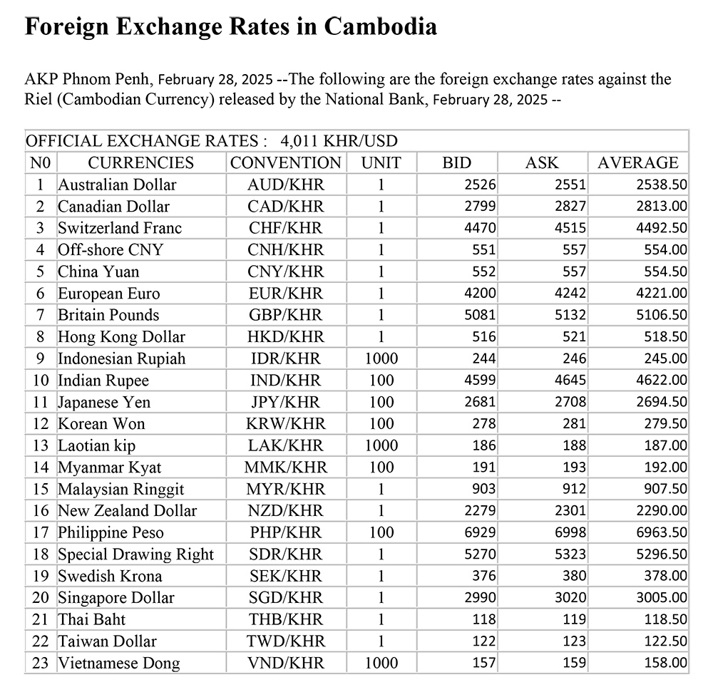 AKP Phnom Penh, February 28, 2025 --The following are the foreign exchange rates against the Riel (Cambodian Currency) released by the National Bank, February 28, 2025 --