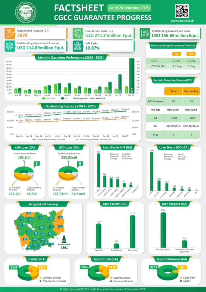 The Credit Guarantee Corporation of Cambodia (CGCC) has provided credit guarantees of US$271 million for micro, small and medium-sized enterprises (MSMEs) as of February 2025 as their working capital for expansion.