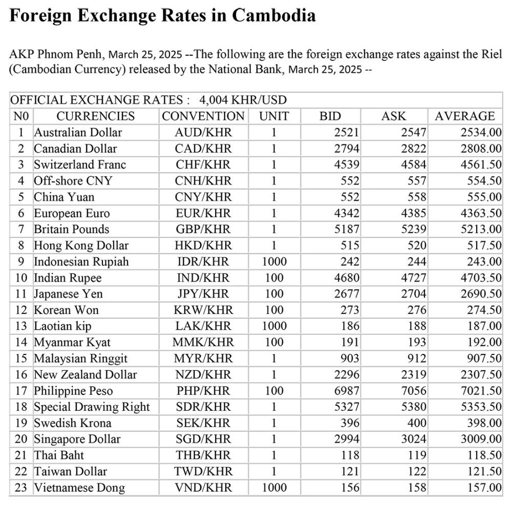 AKP Phnom Penh, March 25, 2025 --The following are the foreign exchange rates against the Riel (Cambodian Currency) released by the National Bank, March 25, 2025 --