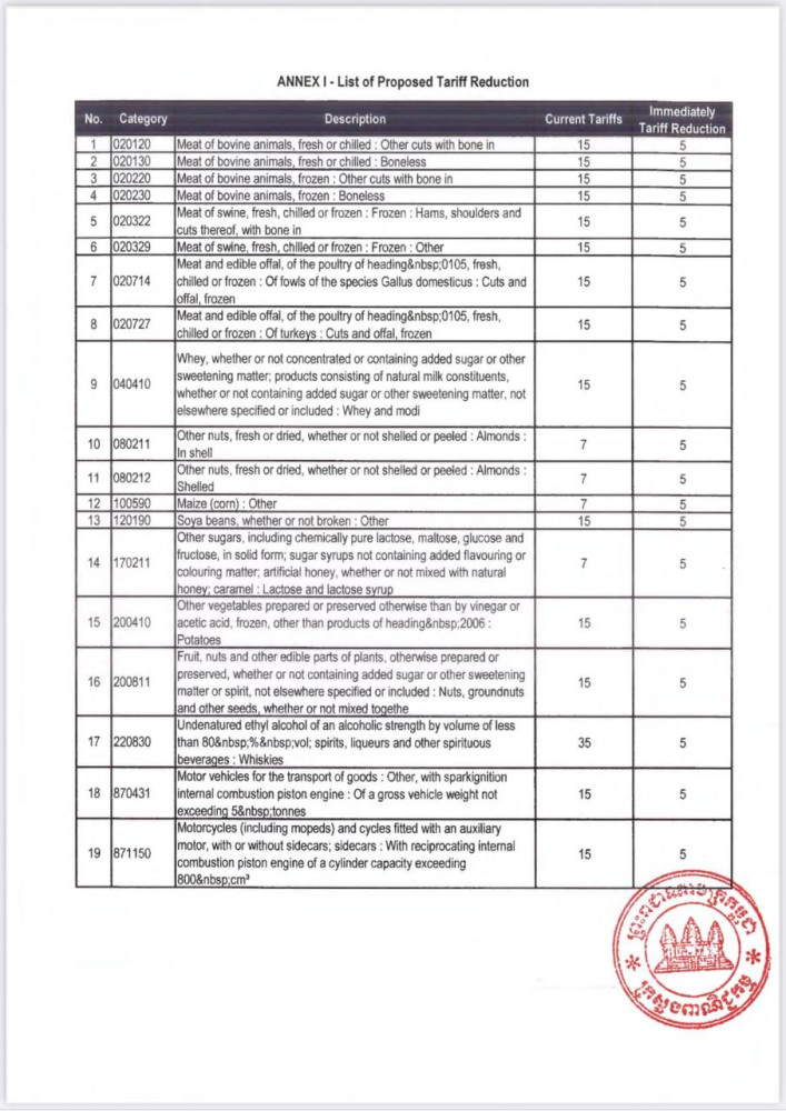 The Royal Government of Cambodia has announced an immediate tariff reduction of 19 categories of U.S. product imports and requested the U.S. side for negotiations regarding tariff implementation on Cambodian imports.