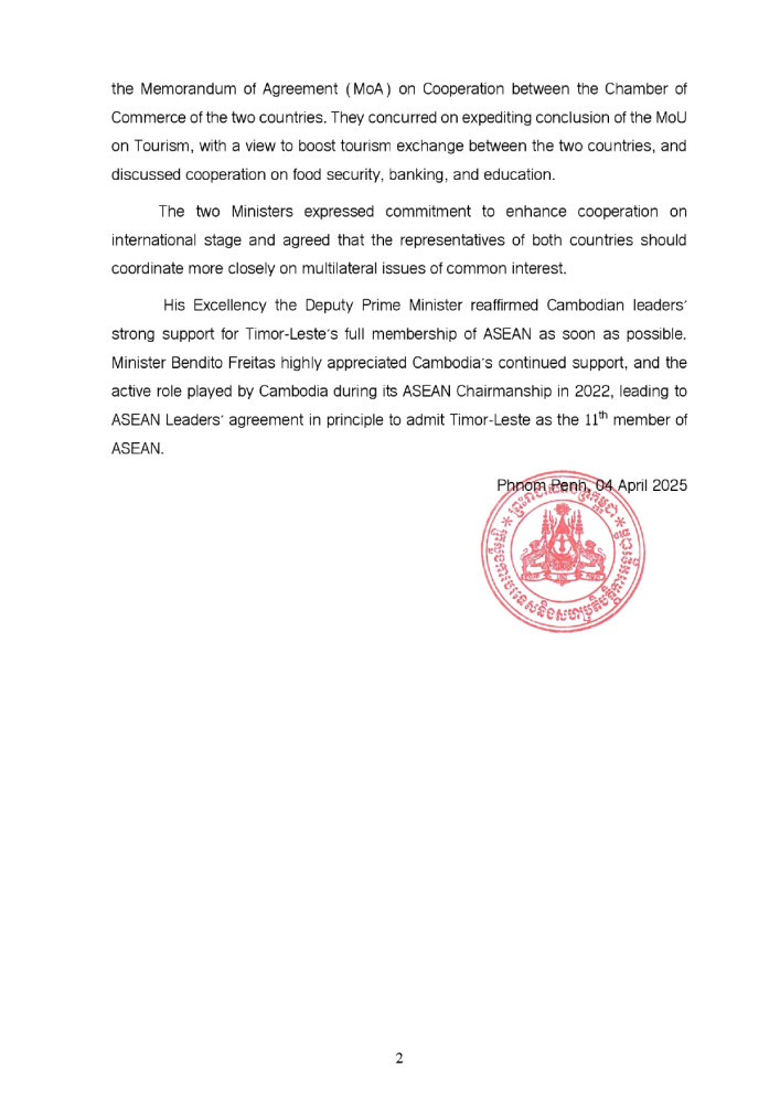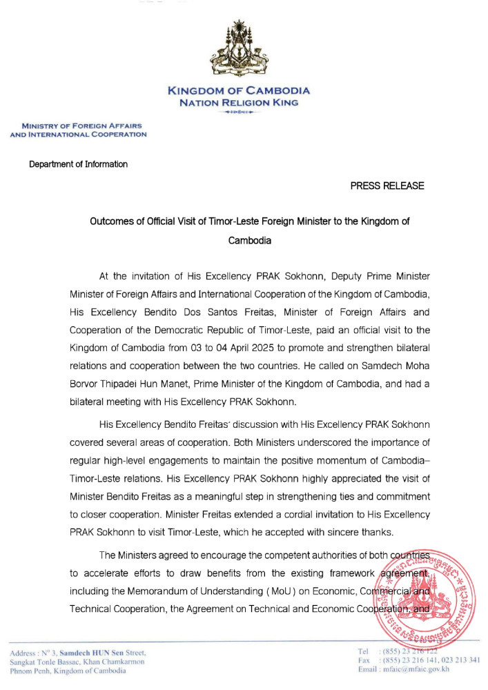 AKP Phnom Penh, April 05, 2025 — The following are the outcomes of the official visit of the two-day (April 3-4) visit of H.E. Bendito dos Santos Freitas, Minister of Foreign Affairs and Cooperation of Timor-Leste to Cambodia, released this morning by the Ministry of Foreign Affairs and International Cooperation: