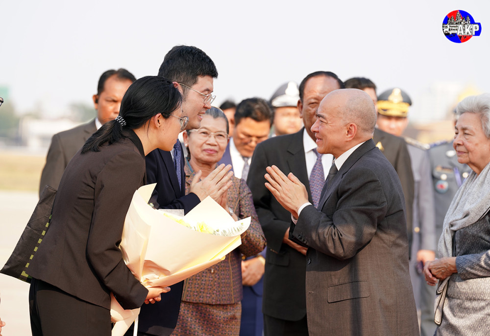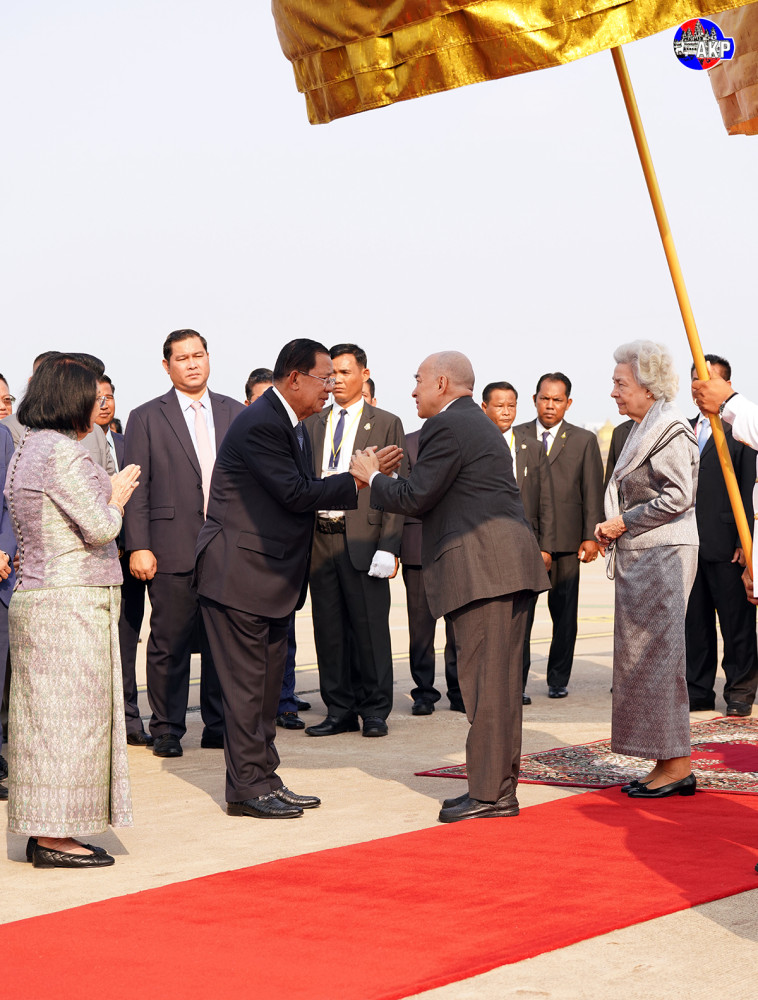 Their Majesties the King and Queen-Mother were welcomed upon their arrival at Phnom Penh International Airport by Senate President Samdech Akka Moha Sena Padei Techo Hun Sen, President of the Supreme Privy Council to His Majesty the King; National Assembly President, Samdech Maha Rathsapheathika Thipadei Khuon Sudary; Prime Minister Samdech Moha Borvor Thipadei Hun Manet; and many other high-ranking officials as well as royal family members and representatives of Chinese Embassy in Cambodia.