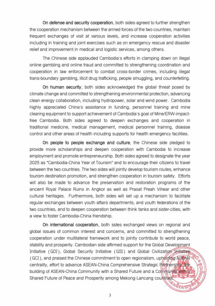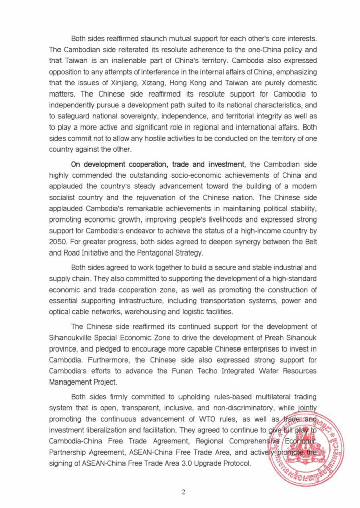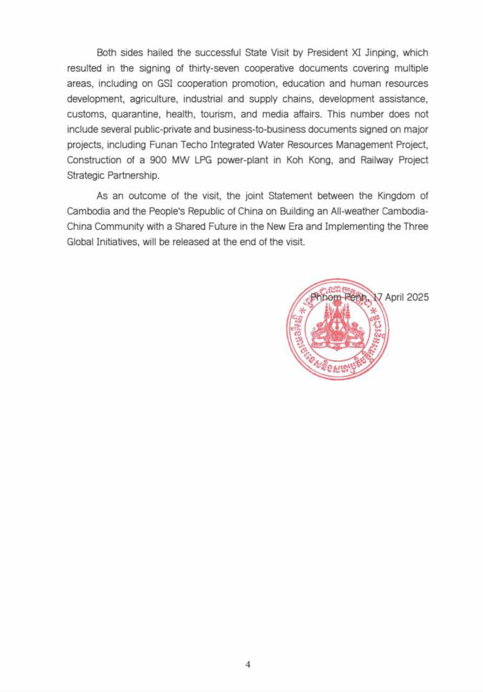 The following are the outcomes of the State Visit of H.E. Xi Jinping, President of the People's Republic of China, to Cambodia, released this morning by the Cambodian Ministry of Foreign Affairs and International Cooperation: