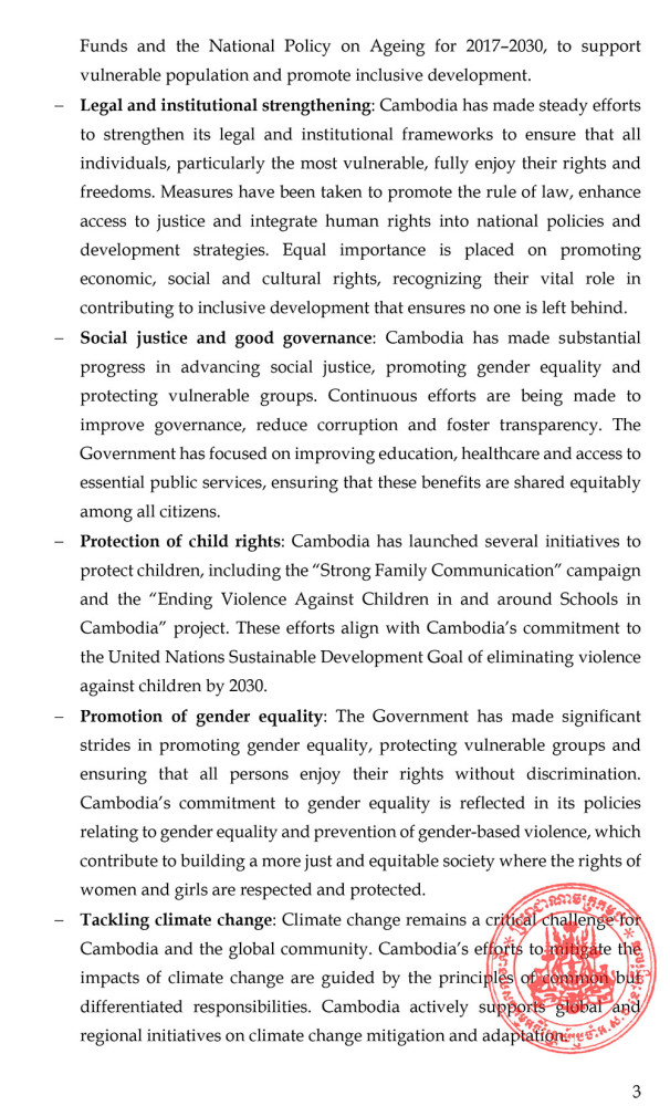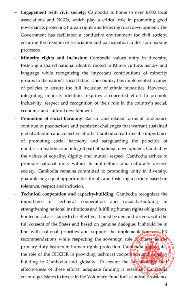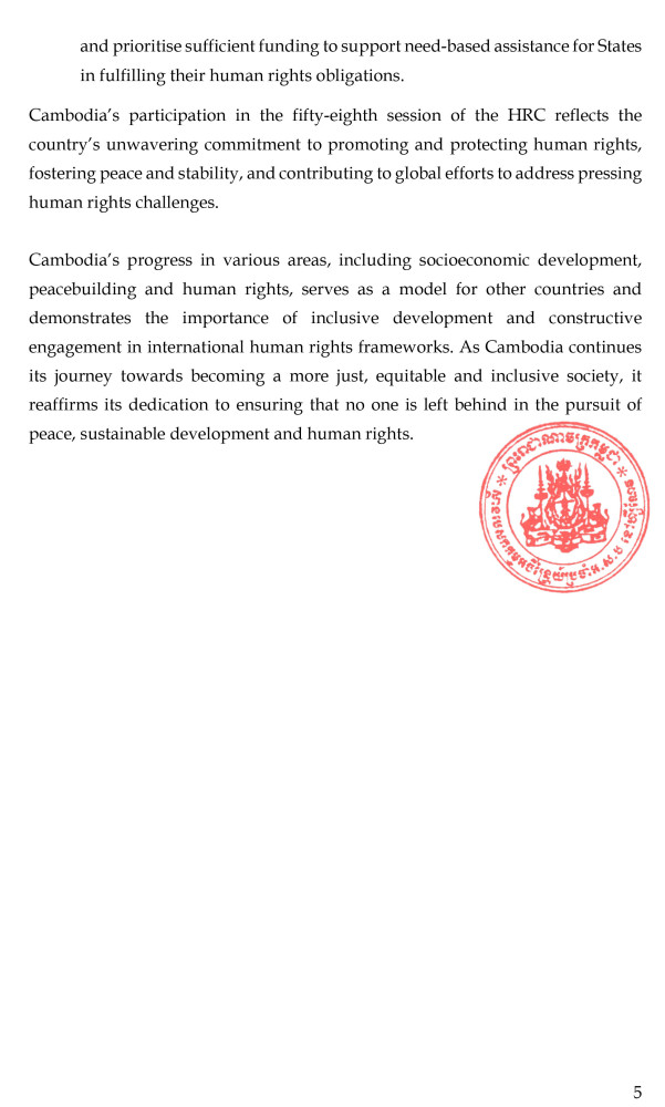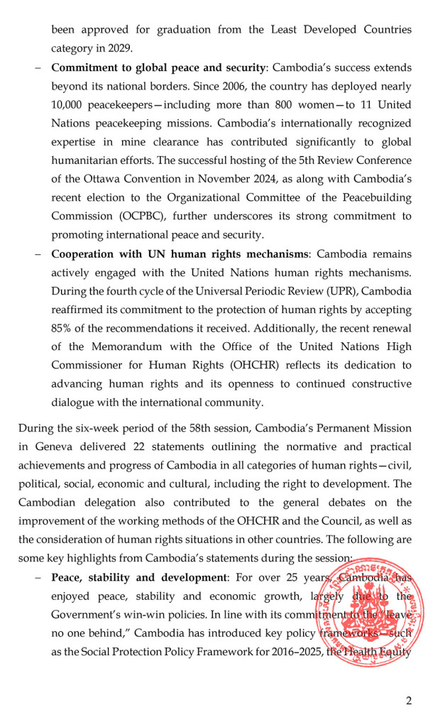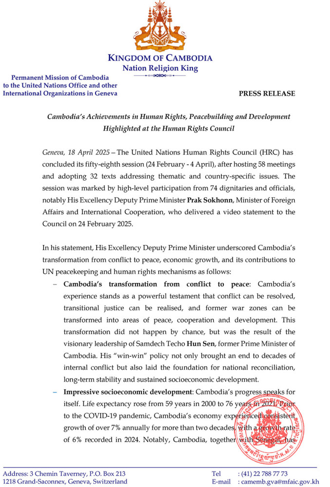 The Permanent Mission of the Kingdom of Cambodia to the United Nations Office and other International Organisations in Geneva on April 18 issued a press release following the conclusion of the 58th session of the United Nations Human Rights Council (HRC).