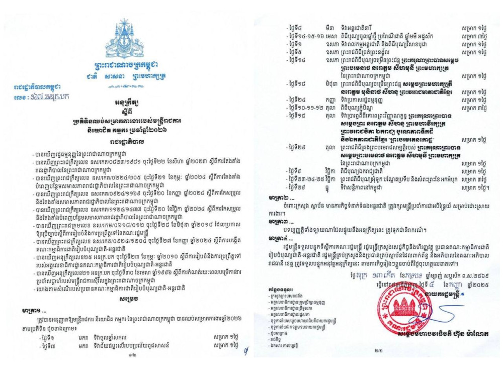 AKP Phnom Penh, September 5, 2025 -- The Royal Government of Cambodia has announced a total of 21 days of official public holidays for 2026, a reduction of one day from the current year.