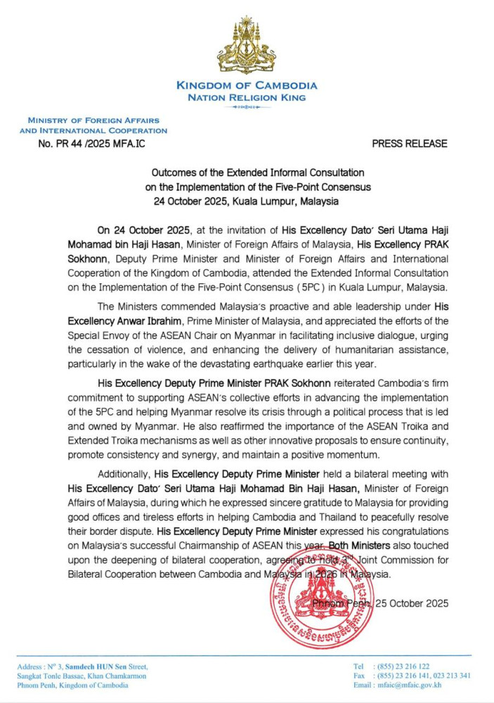 Cambodian Deputy Prime Minister and Minister of Foreign Affairs and International Cooperation H.E. Prak Sokhonn, participated in the Extended Informal Consultation on the Implementation of the Five-Point Consensus (5PC), in Kuala Lumpur, Malaysia on the afternoon of Oct. 24.