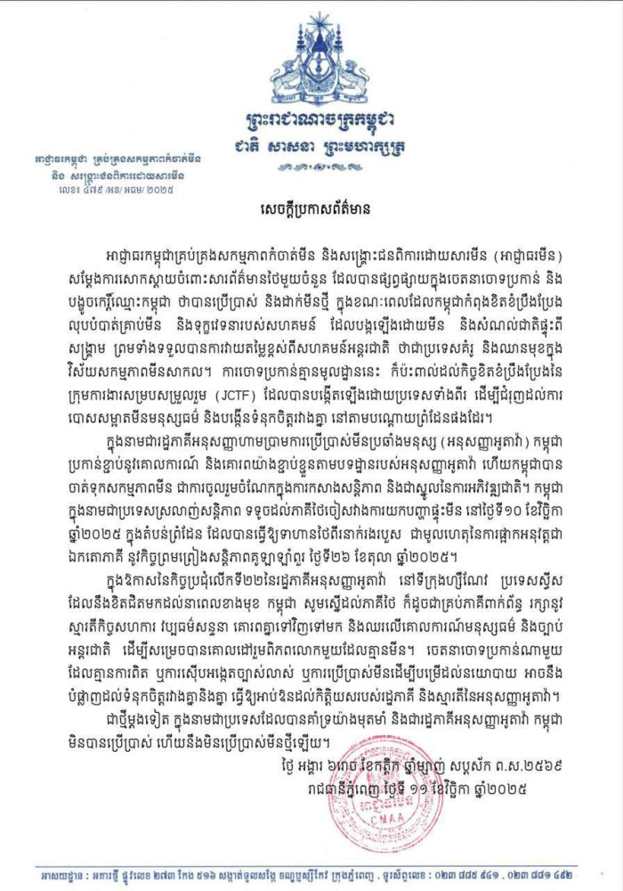 “These baseless accusations come at a time when Cambodia is exerting its utmost efforts to clear landmines and relieve the suffering of communities affected by mines and explosive remnants of war. Such unfounded claims also risk undermining the ongoing cooperative efforts of the Joint Coordinating Task Force (JCTF) established by both countries to advance humanitarian demining and strengthen mutual confidence along the border,” said CMAA in a statement made public this evening.
