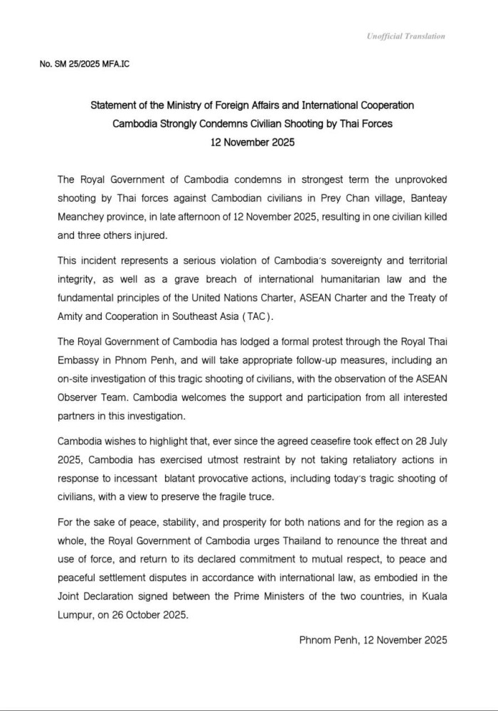 Cambodian Minister of Foreign Affairs and International Cooperation Strongly Condemns Civilian Shooting by Thai Forces