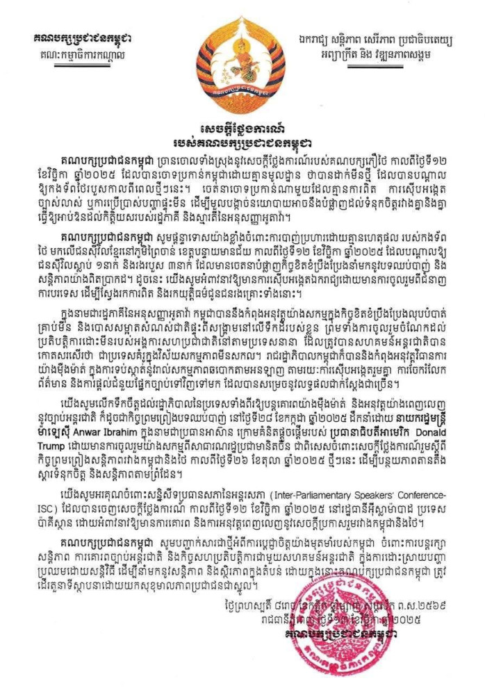 Moreover, CPP encouraged the governments of both countries to fully uphold and implement the international law, as well as the ceasefire agreement reached on July 28, 2025, brokered under the leadership of Prime Minister of Malaysia Anwar Ibrahim as the ASEAN Chair, at the initiative of President of the United States Donald Trump, and with the active participation of the People's Republic of China, especially the recent Joint Declaration between Cambodia and Thailand signed on Oct. 26, 2025 in order to de-escalate the tension, restore confidence and peace along the border.