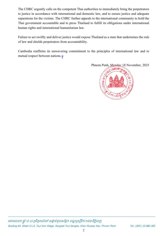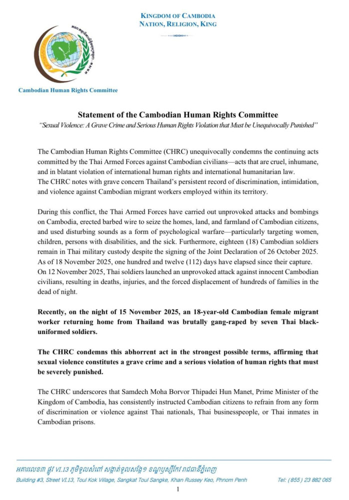 The Cambodian Human Rights Committee (CHRC) has strongly condemned the inhumane act committed by seven Thai black-uniformed soldiers against an 18-year-old Cambodian female migrant worker who was returning home from Thailand.