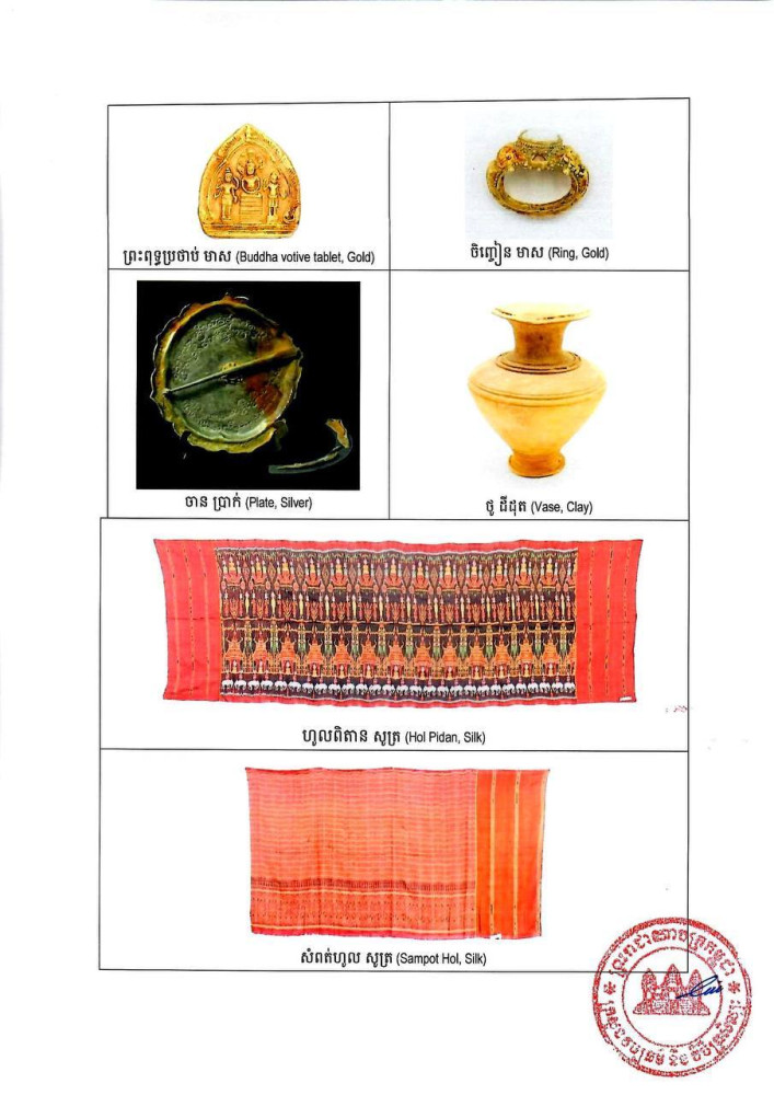 Among the significant Khmer cultural heritage objects which will be returned to Cambodia under this agreement are 183 pieces of Khmer silk textiles - a remarkable collection which significantly increases the National Museum's existing collection of textiles as well as prehistoric artifacts such as coins, beads, jewelry, and items made of precious metals, bronze, stone and clay. Many of these objects were looted from Cambodia during the decades of civil war. The return also includes several other important collections, such as stone and bronze objects from both the Pre-Angkor and Angkor periods.