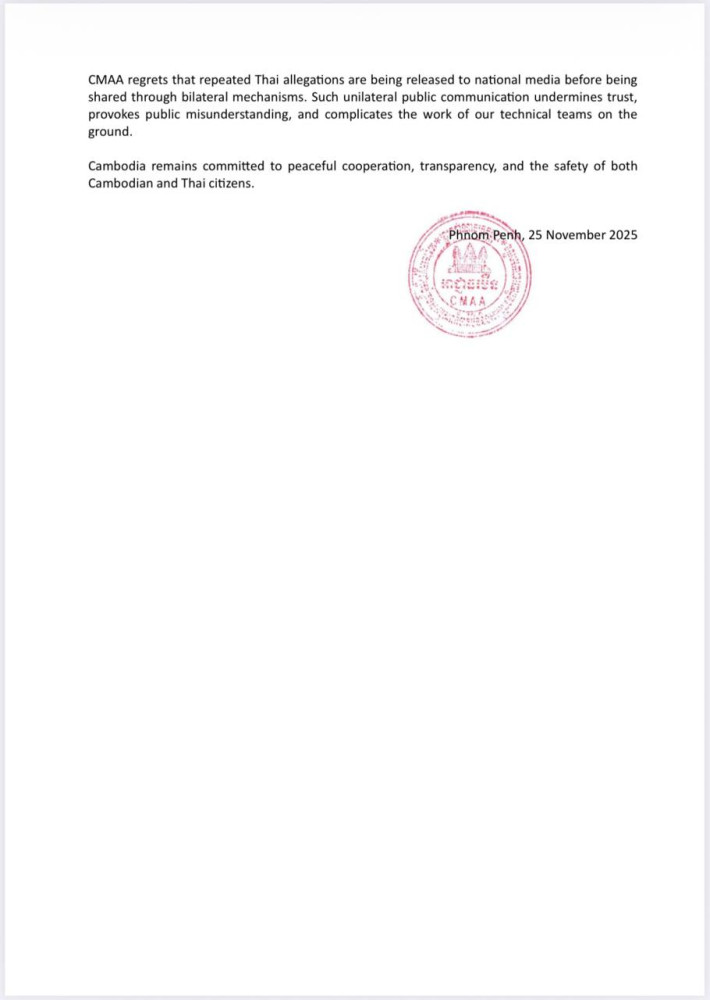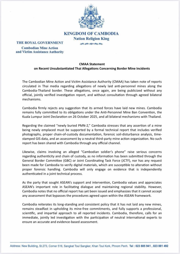 Statement of the Cambodian Mine Action and Victim Assistance Authority on Recent Unsubstantiated Thai Allegations Concerning Border Mine Incidents