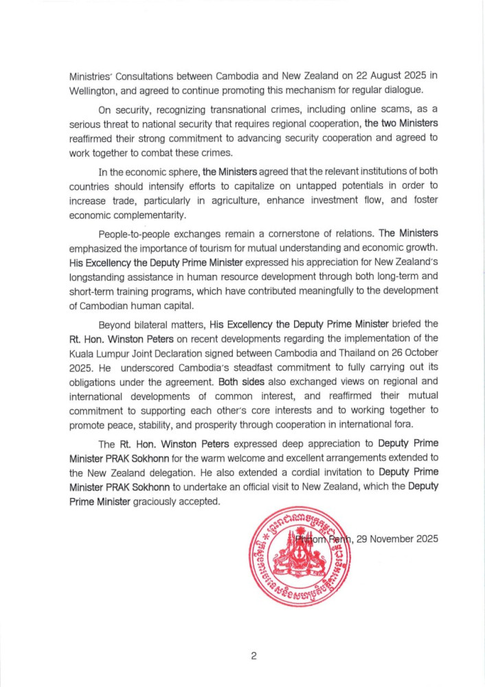 Outcomes of Official Visit of Foreign Minister of New Zealand to Cambodia