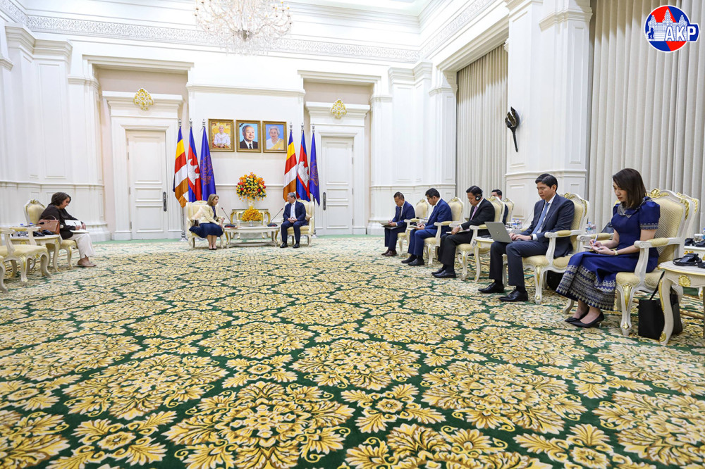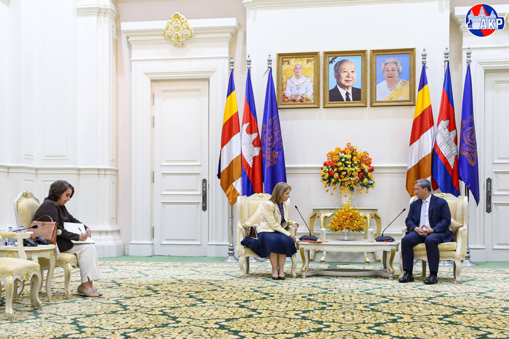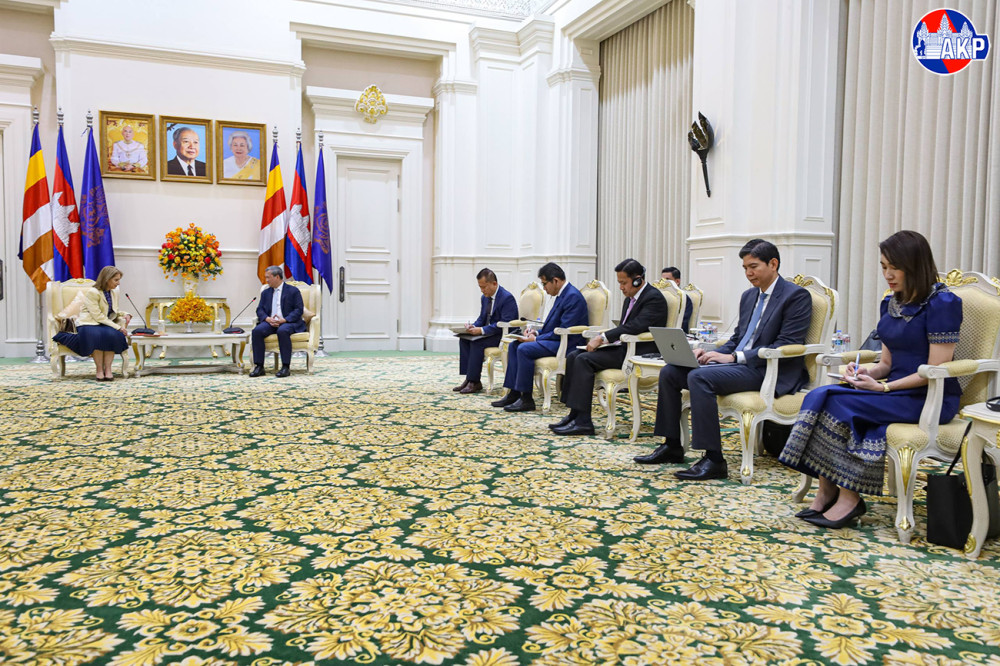 Cambodia’s Prime Minister Samdech Moha Borvor Thipadei Hun Manet (R, Pic. 1) shakes hands with H.E. Ms. Vivian Loss Sanmartin, Ambassador of the Federative Republic of Brazil to Cambodia, prior to their meeting at the Peace Palace in Phnom Penh this morning.