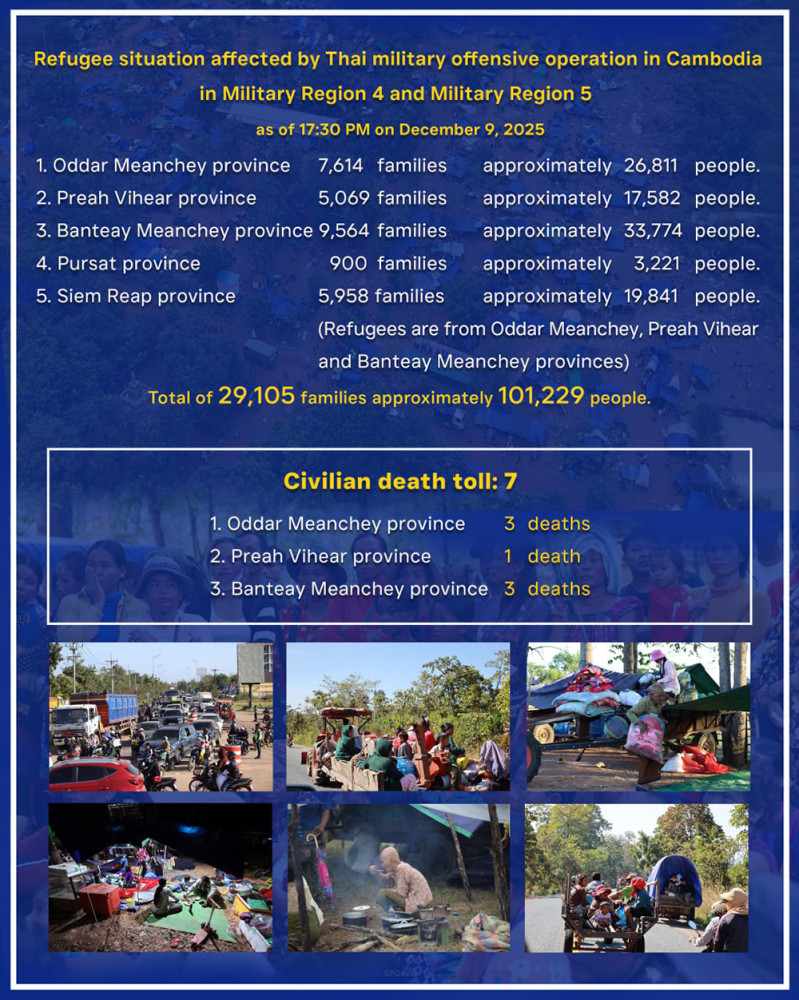 The number of civilians displaced by the Thai military’s aggressive attacks in Military Regions 4 and 5 has risen to 29,105 families, or approximately 101,229 people, as of 5:30 p.m. on Dec. 9, 2025.