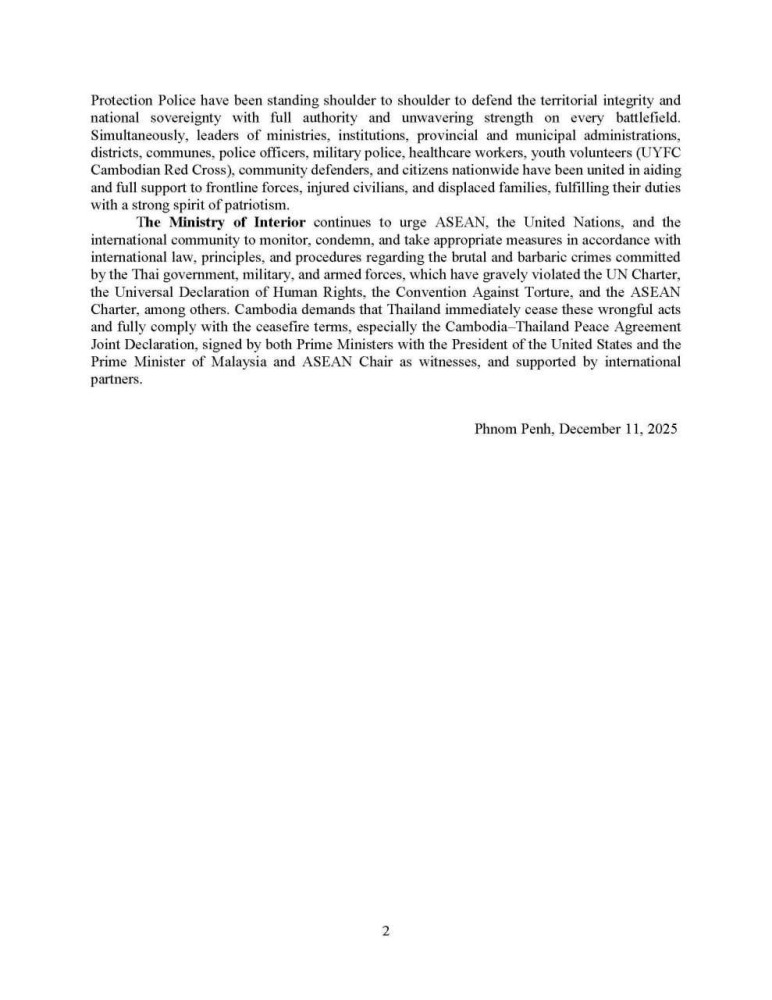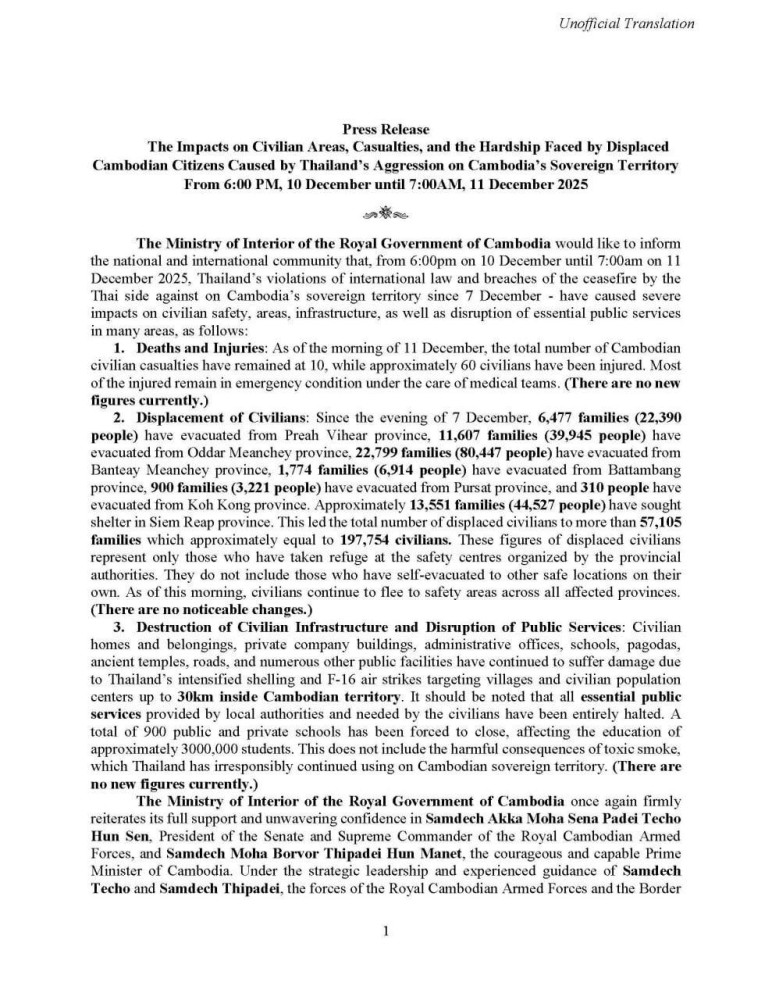 The Ministry of Interior this afternoon issued a press release on the impact on civilian areas, casualties, and hardship faced by displaced Cambodian citizens due to Thailand’s aggression on Cambodia’s sovereign territory from 6:00 p.m. on Dec. 10 until 7:00 a.m. on Dec. 11.