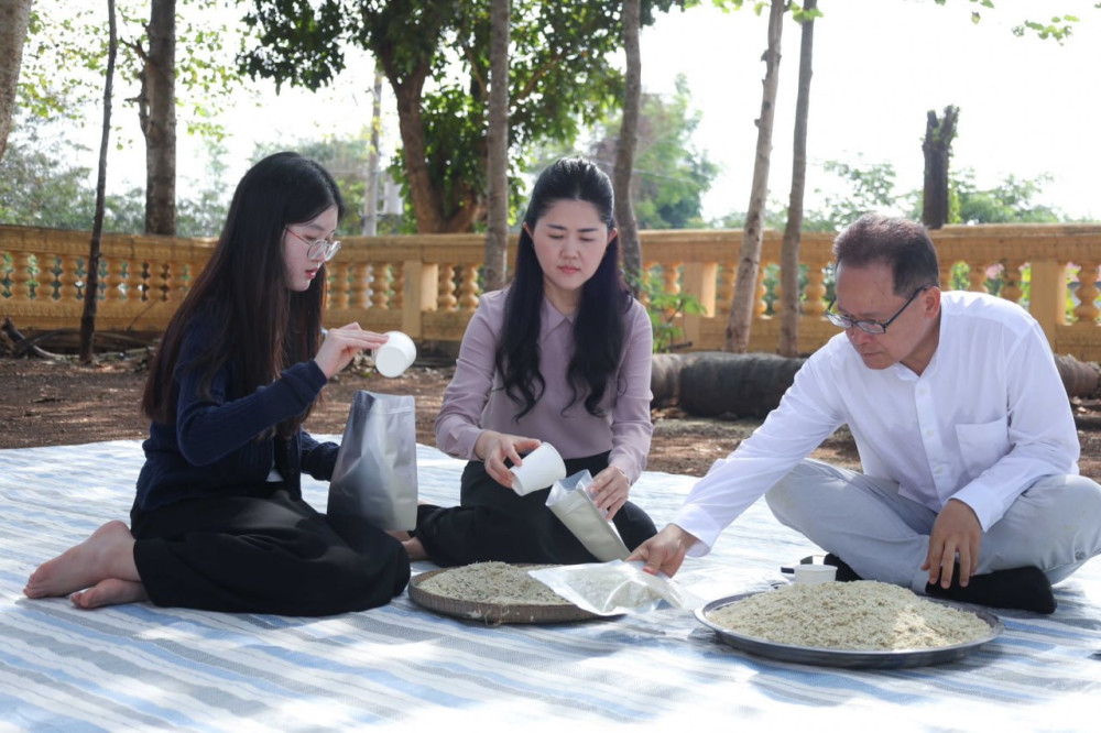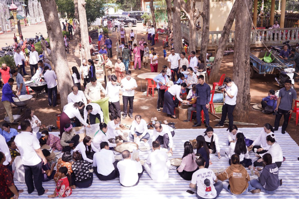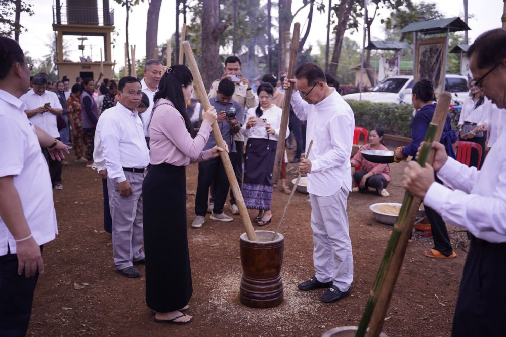 The delegation gathered with local authorities and communities in O’Reang Ov district for the ceremony, which included a traditional segment where the Minister and his family actively participated in the preparation and pounding of Ambok—freshly harvested rice flakes. The prepared Ambok was then packaged for immediate distribution to Cambodian frontline soldiers.