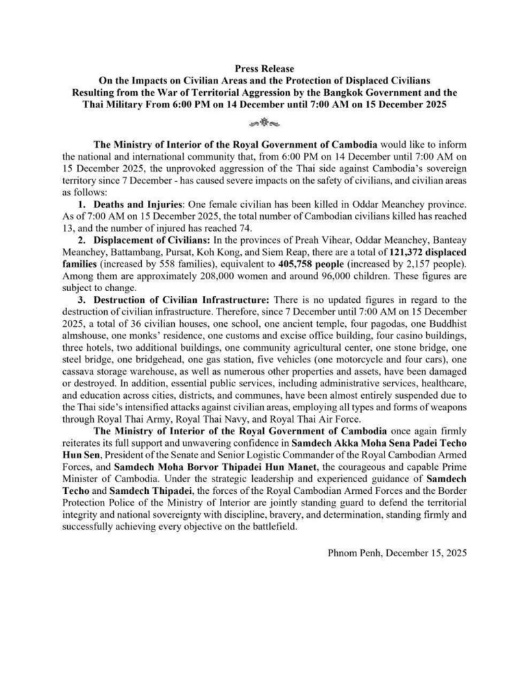 The Ministry of Interior this afternoon provided an update on the impacts on civilian areas and the protection of displaced civilians resulting from the war of territorial aggression by the Bangkok Government and the Thai Military from 6:00 p.m. on Dec. 14 to 7:00 a.m. on Dec. 15, 2025.