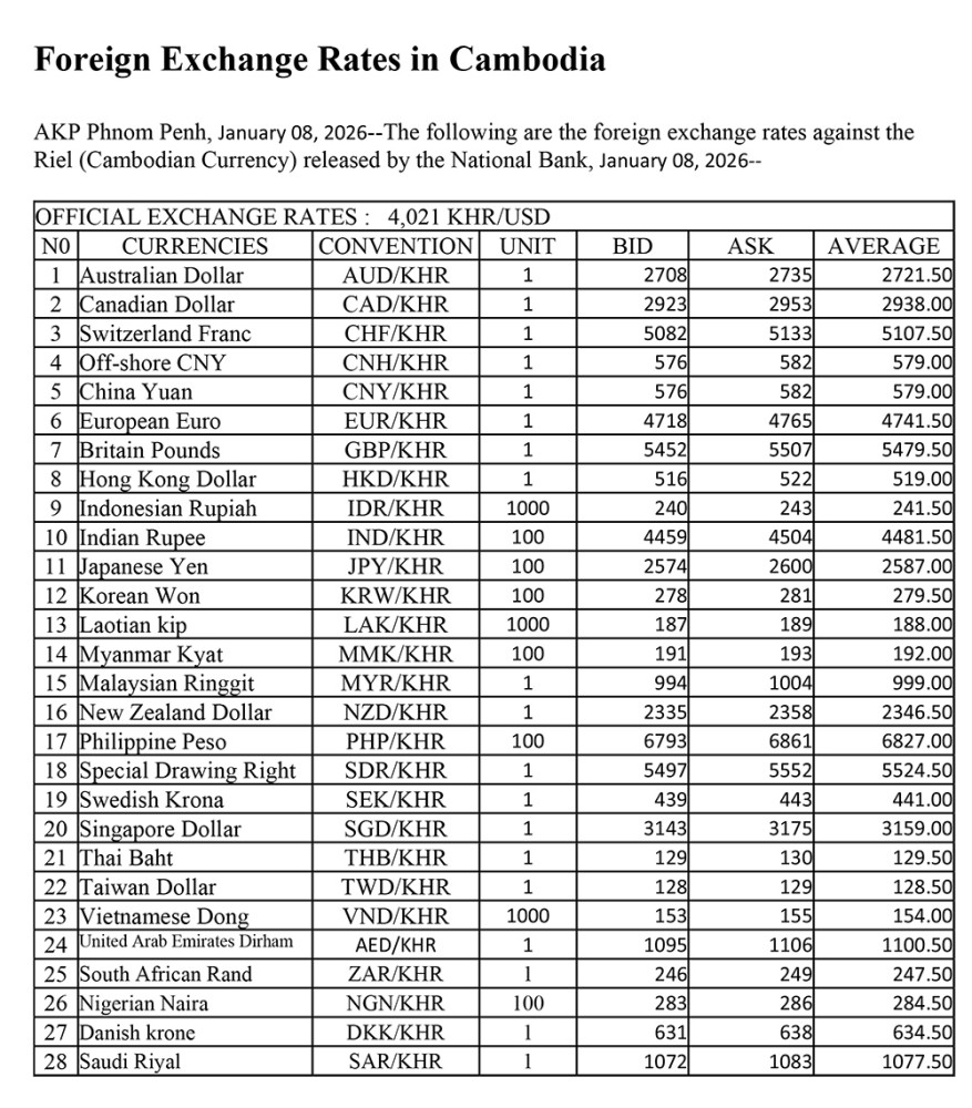 AKP Phnom Penh, January 08, 2026--The following are the foreign exchange rates against the Riel (Cambodian Currency) released by the National Bank, January 08, 2026--