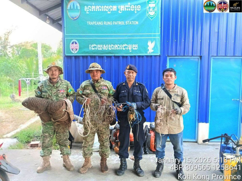 In a separate operation within the Tatay Wildlife Sanctuary, rangers from the Trapaing Roung patrol post confiscated 49 animal snares, 6 metres of nylon fishing line, 100 hooks, and one battery-powered shocking device. The equipment was found in Trapaing Roung village of the province's Koh Kong district.