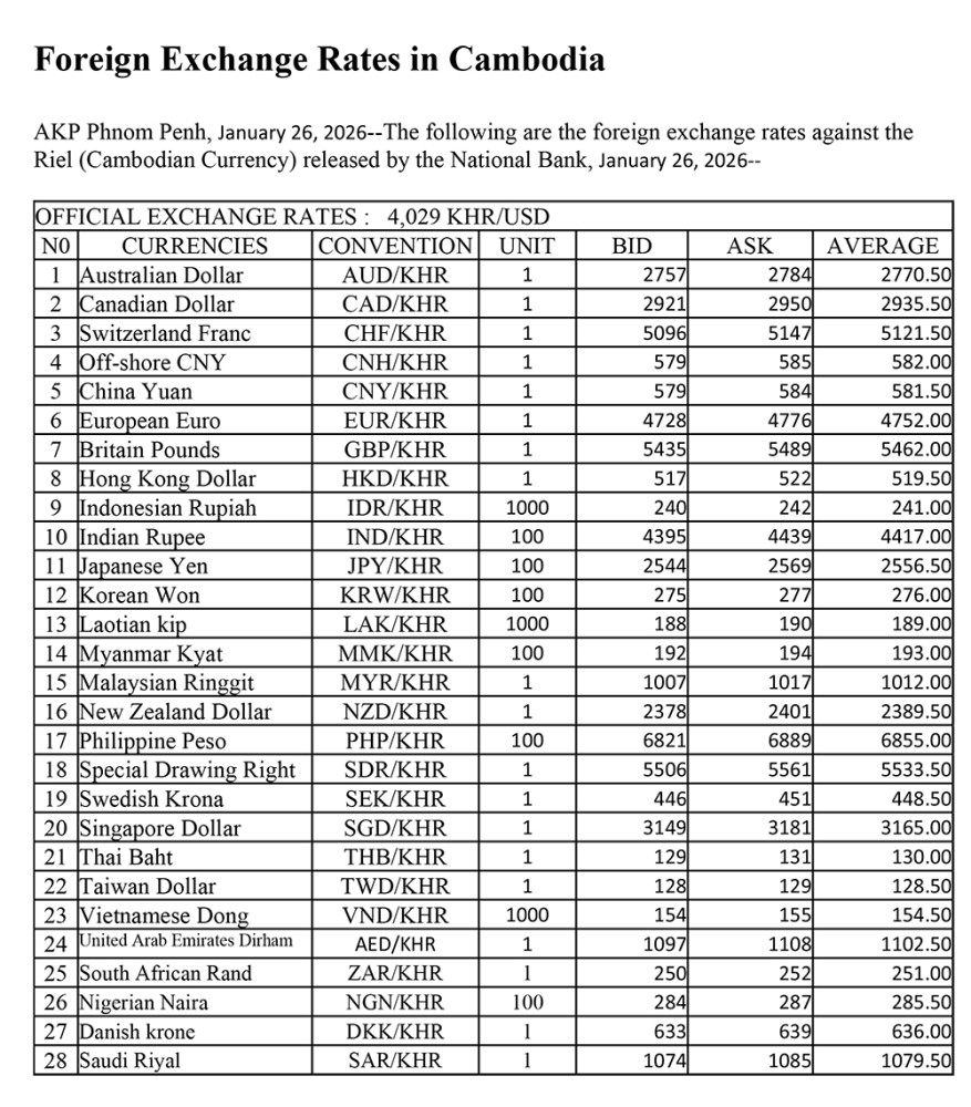 AKP Phnom Penh, January 26, 2026--The following are the foreign exchange rates against the Riel (Cambodian Currency) released by the National Bank, January 26, 2026--