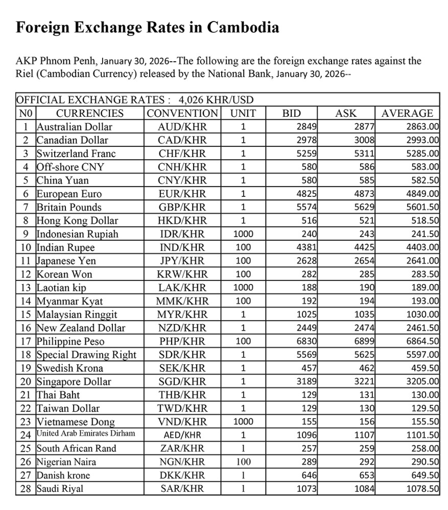 AKP Phnom Penh, January 30, 2026--The following are the foreign exchange rates against the Riel (Cambodian Currency) released by the National Bank, January 30, 2026--