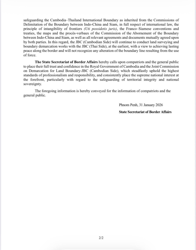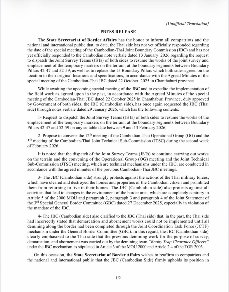 Cambodia Requests Thailand to Deploy Joint Survey Teams to Resume Temporary Boundary Demarcation in February
