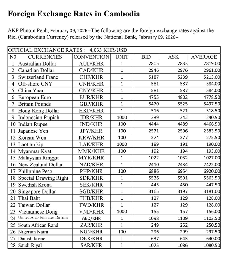 AKP Phnom Penh, February 09, 2026--The following are the foreign exchange rates against the Riel (Cambodian Currency) released by the National Bank, February 09, 2026--