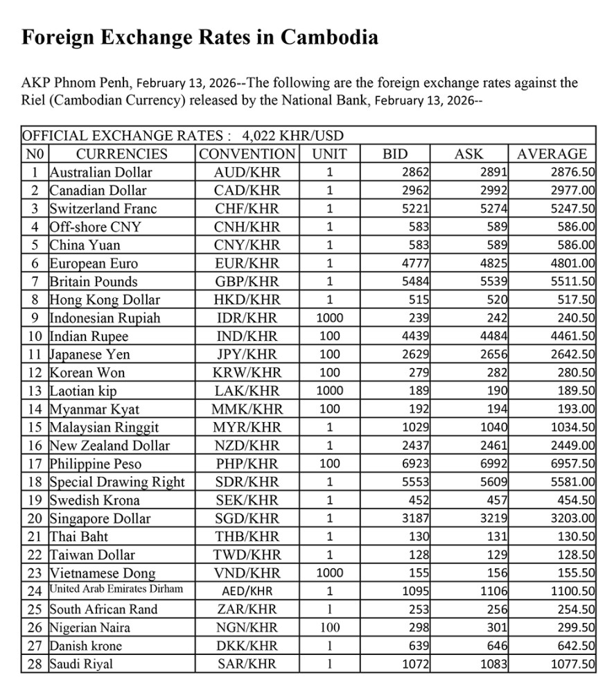 AKP Phnom Penh, February 13, 2026--The following are the foreign exchange rates against the Riel (Cambodian Currency) released by the National Bank, February 13, 2026--