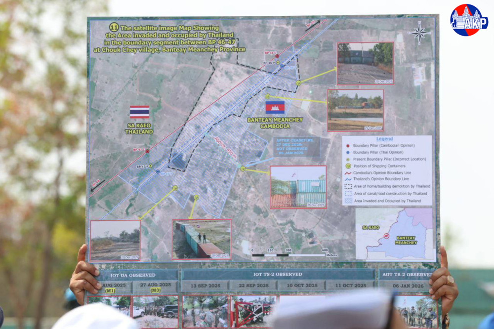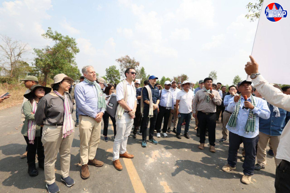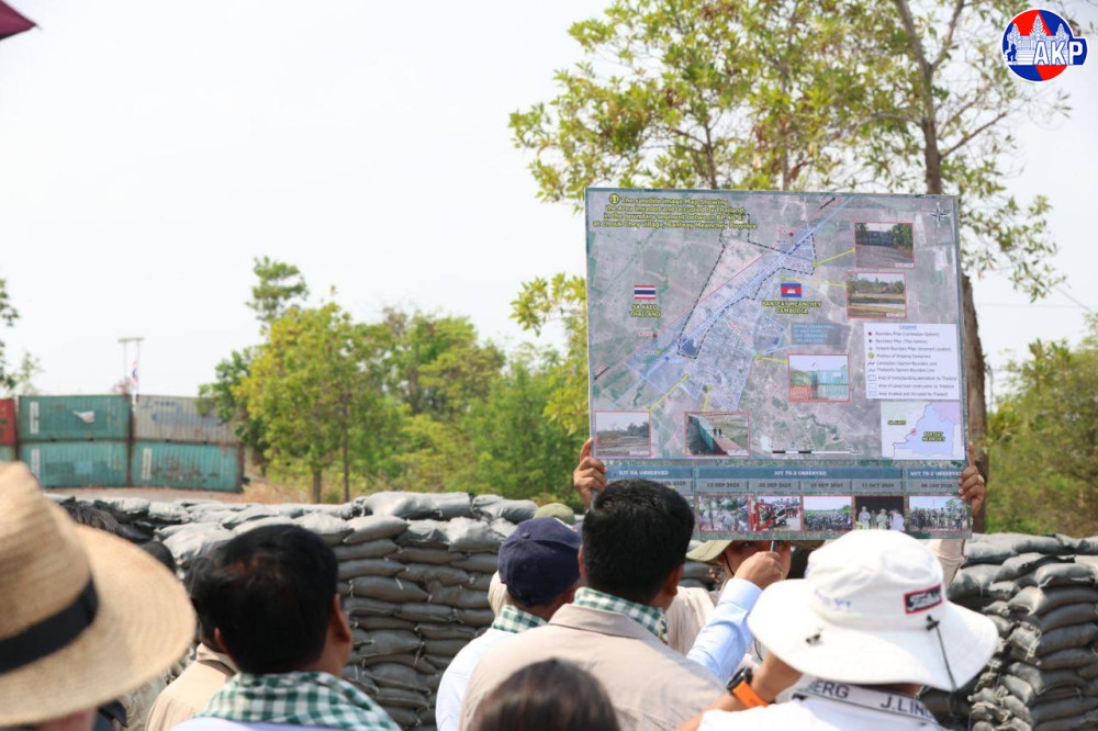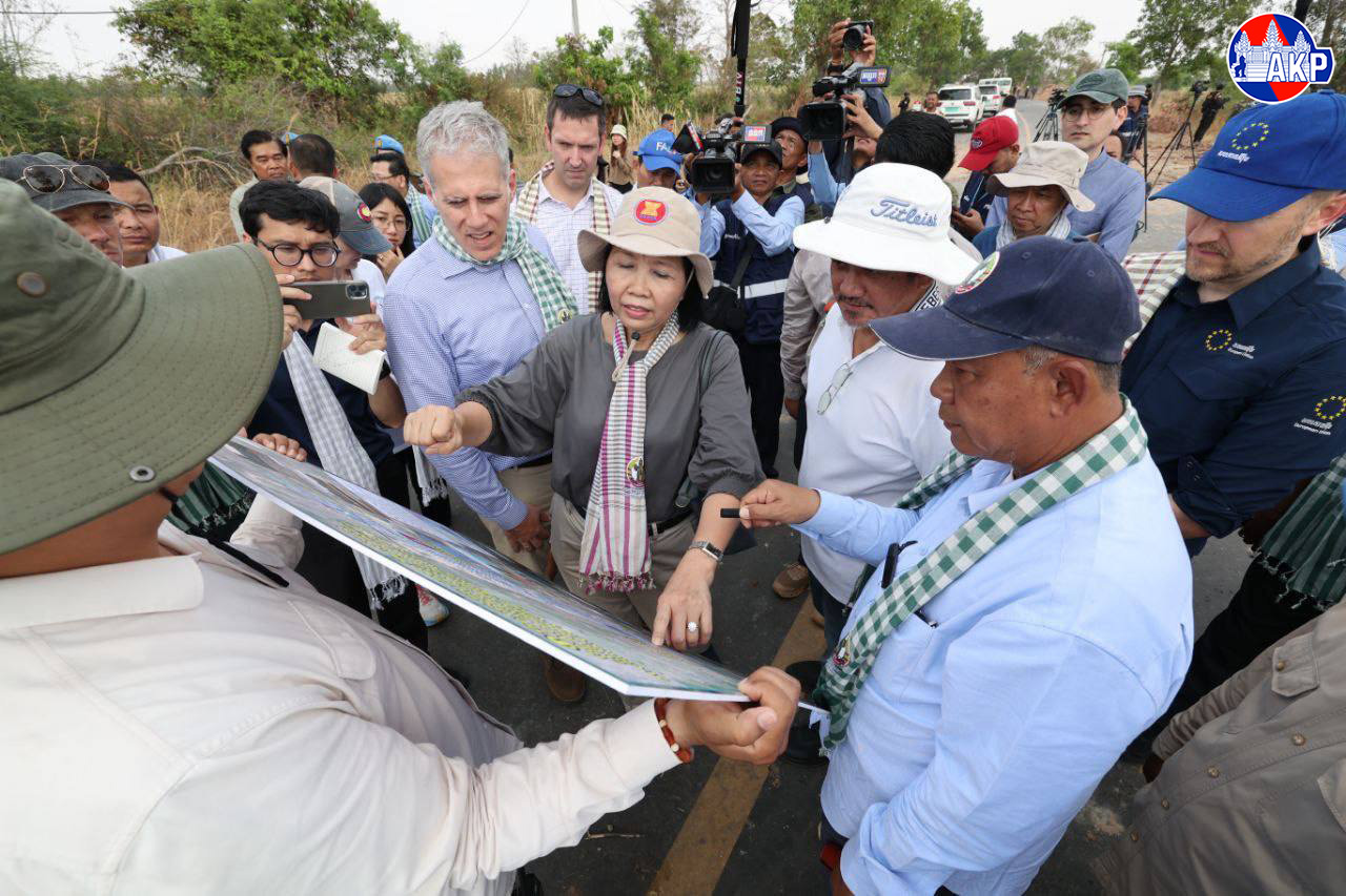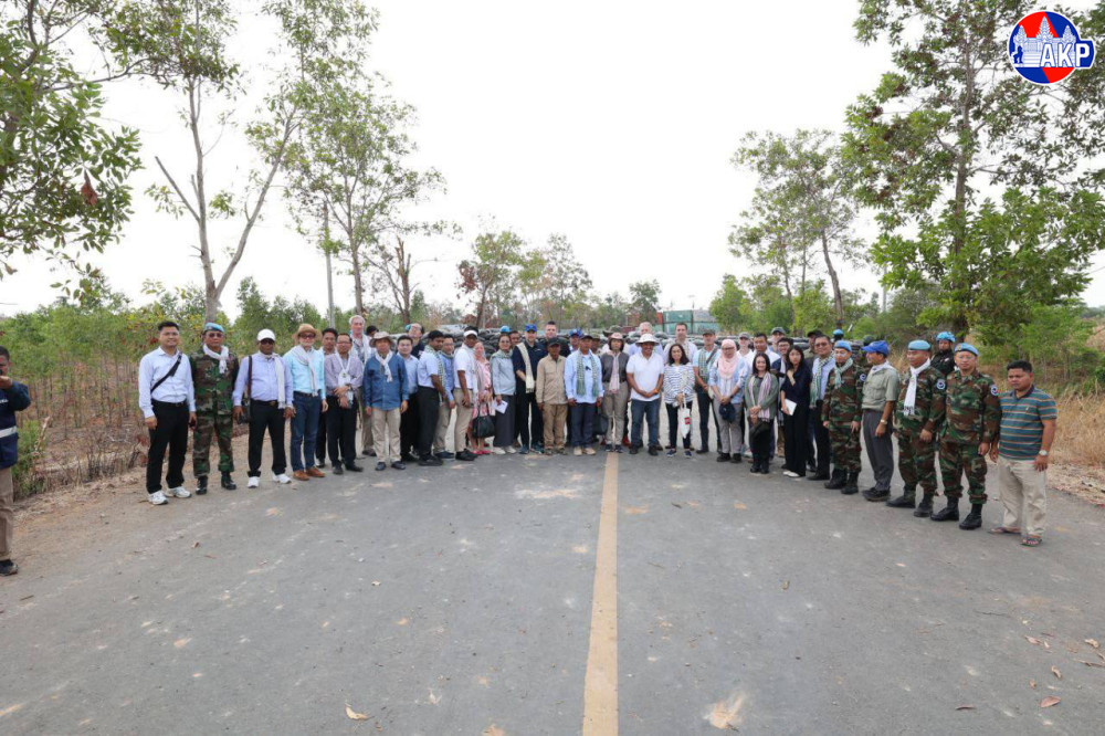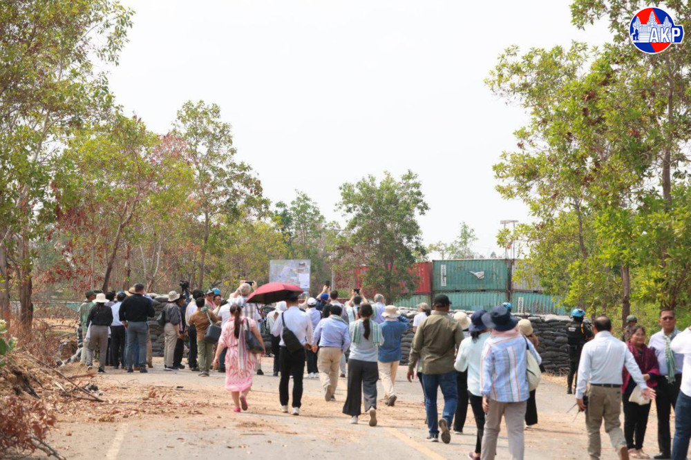 A delegation of foreign diplomats and representative of international agencies accredited to Cambodia, led by H.E. Mrs. Eat Sophea (C. Pic. 1), Acting Minister of Foreign Affairs and International Cooperation, and accompanied by provincial authorities, this morning conducts a field visit to assess Thailand’s violation of Cambodian territory by installing barbed wire and placing containers in Chouk Chey and Prey Chan villages, O’Beichoan commune, O’Chrov district, Banteay Meanchey province.