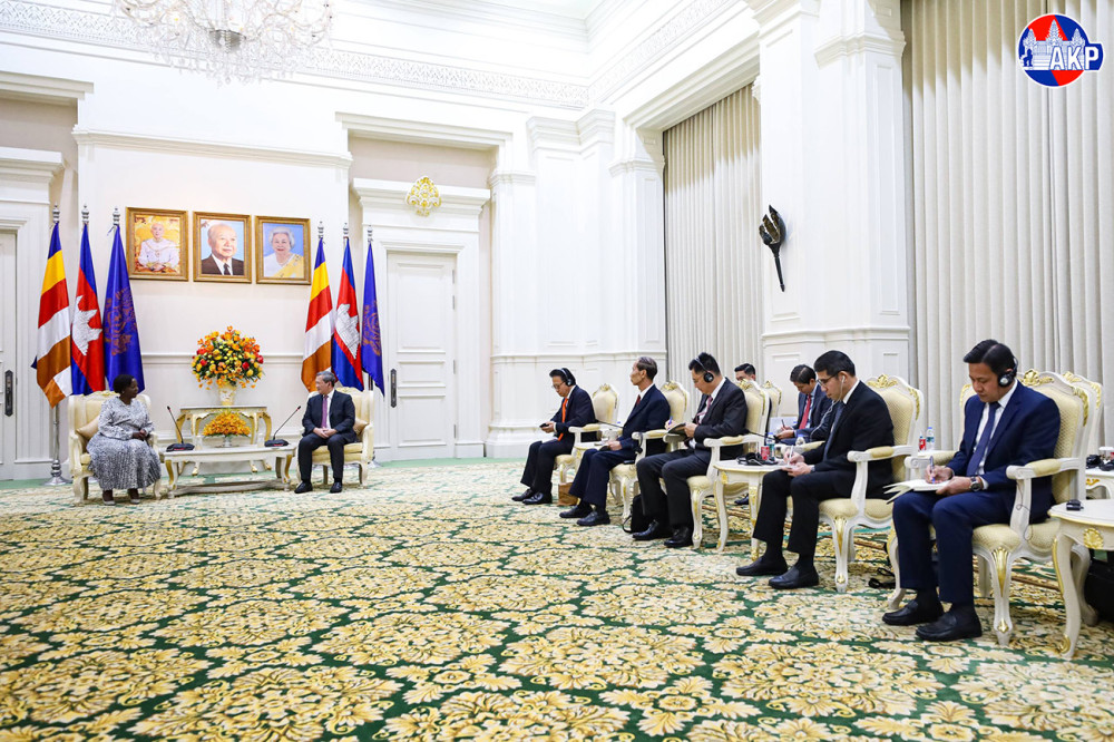 Samdech Moha Borvor Thipadei Hun Manet (R, Pic. 1), Prime Minister of the Kingdom of Cambodia, poses for a photo with visiting H.E. Ms. Louise MUSHIKIWABO, Secretary-General of the International Organisation of La Francophonie (OIF), prior to their meeting at the Peace Palace in Phnom Penh this afternoon.