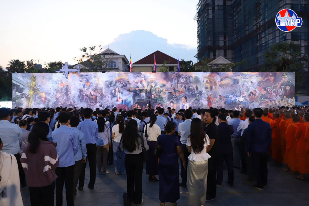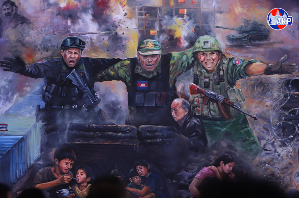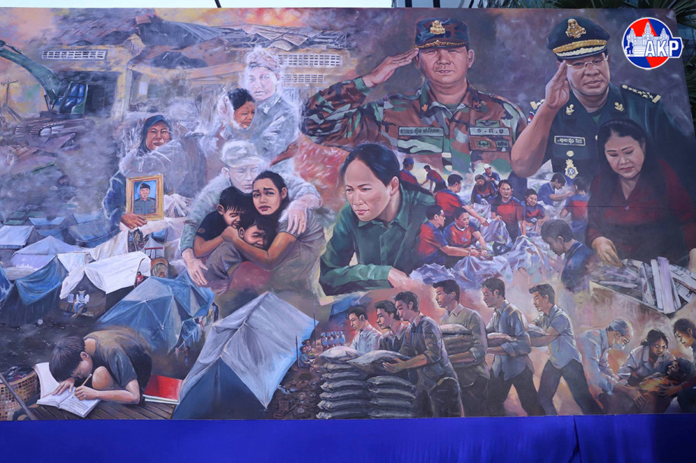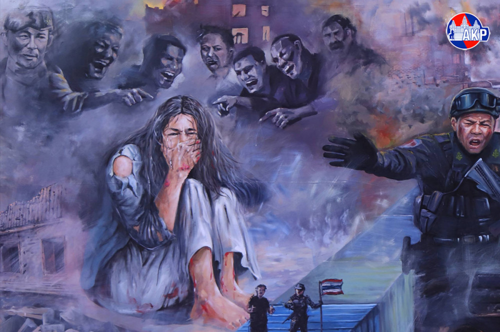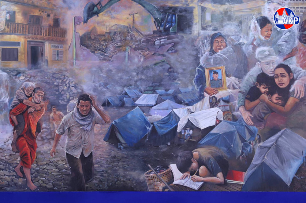 This massive mural depicts immeasurable suffering of Cambodian civilians caused by the recent Thai military aggression and the unwavering unity of the Cambodian people in their pursuit of lasting peace.