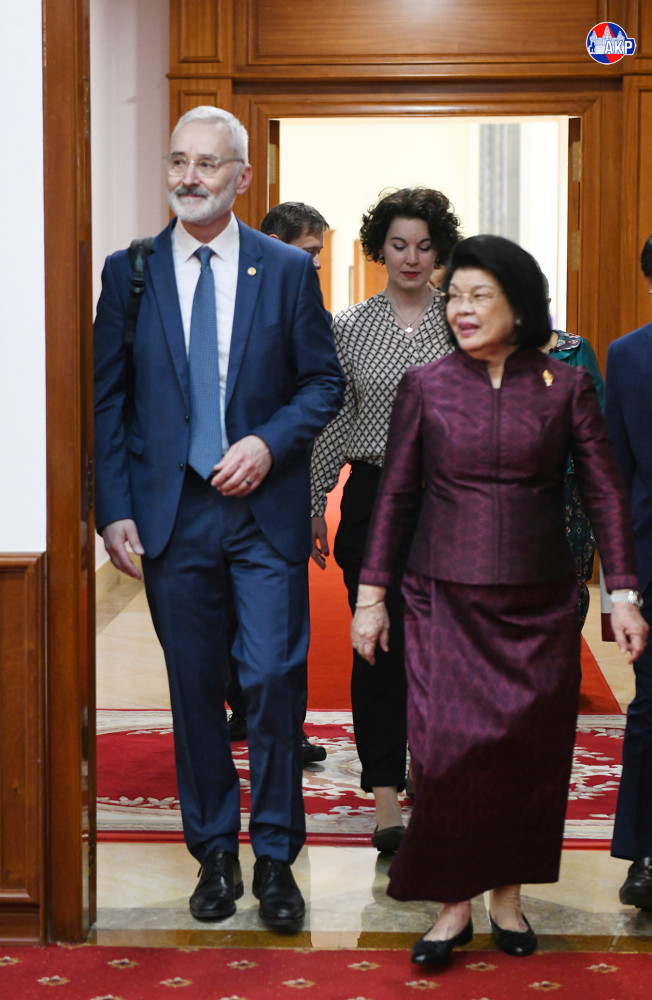 Samdech Maha Rathsapheathika Thipadei Khuon Sudary (R, Pic. 1), President of the National Assembly (NA) of the Kingdom of Cambodia, receives visiting H.E. György Such, Secretary General of the Hungarian NA, at the NA Palace, in Phnom Penh this morning.