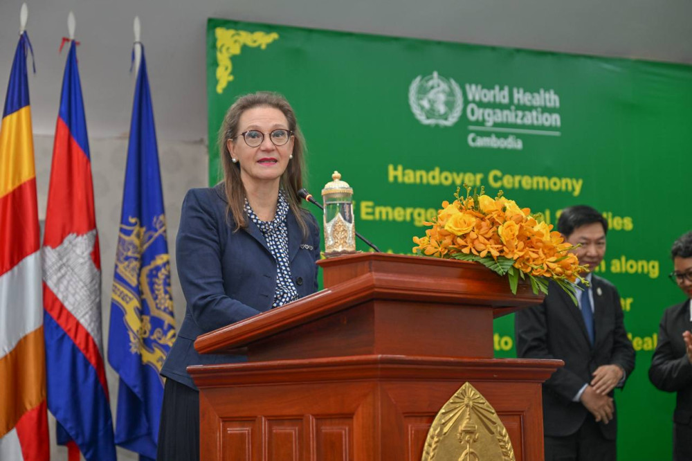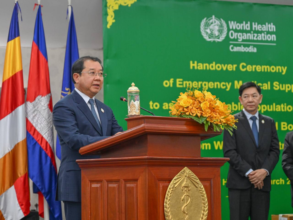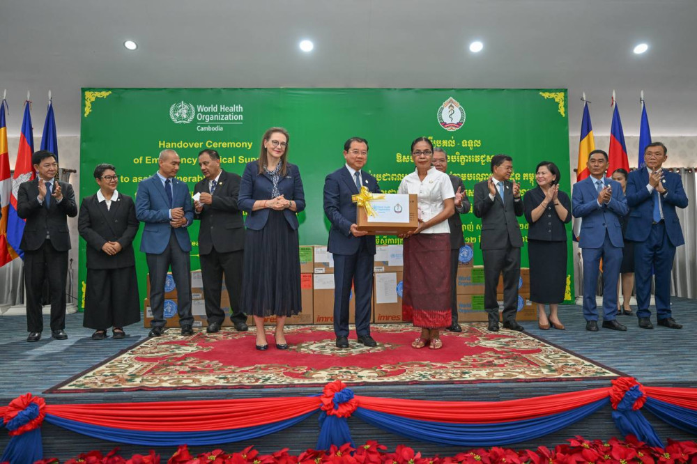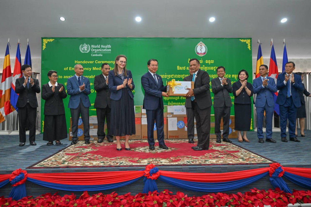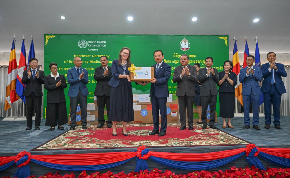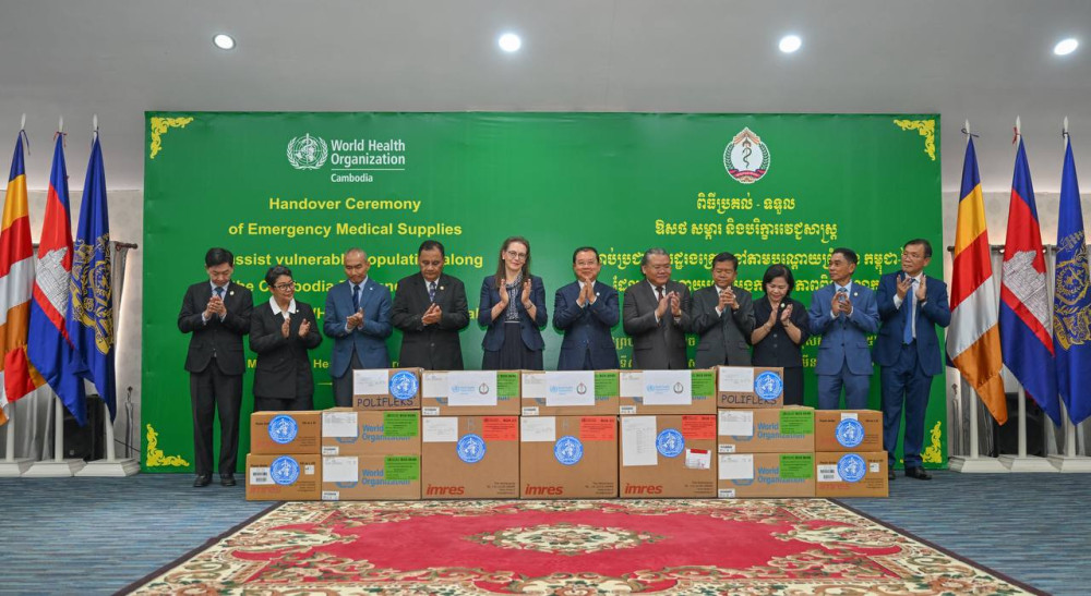 Cambodia’s Minister of Health H.E. Prof. Chheang Ra (R Front, Pic. 1) receives at the Ministry this morning emergency medical supplies from Dr. Marianna Trias, Representative of the World Health Organisation (WHO) to Cambodia, to assist vulnerable population along the Cambodia-Thailand border.