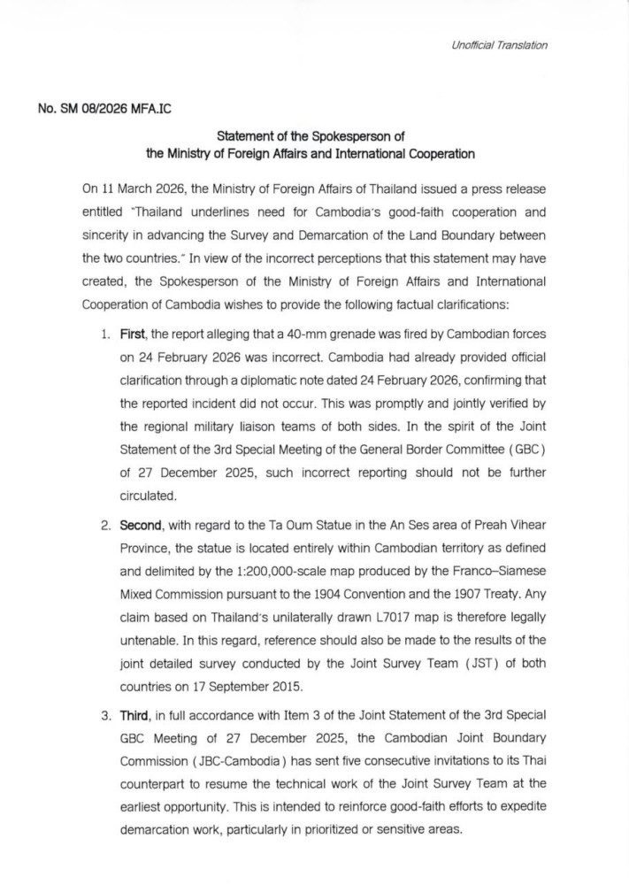On 11 March 2026, the Ministry of Foreign Affairs of Thailand issued a press release entitled "Thailand underlines need for Cambodia's good-faith cooperation and sincerity in advancing the Survey and Demarcation of the Land Boundary between the two countries. In view of the incorrect perceptions that this statement may have created, the Spokesperson of the Ministry of Foreign Affairs and International Cooperation of Cambodia wishes to provide the following factual clarifications: