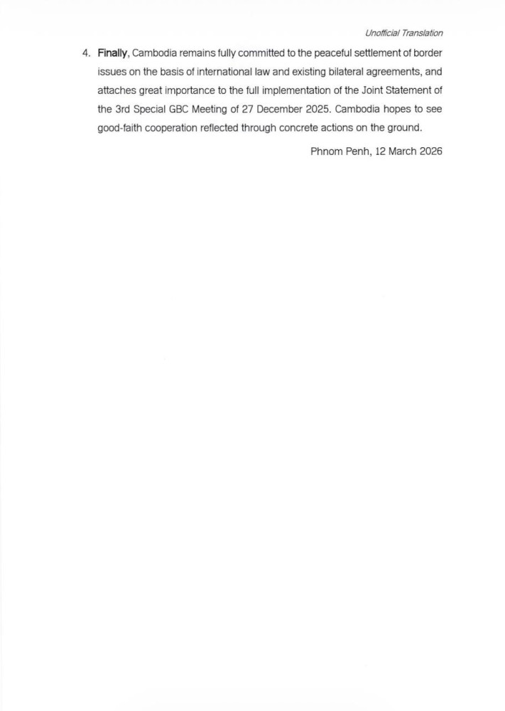 4. Finally, Cambodia remains fully committed to the peaceful settlement of border issues on the basis of international law and existing bilateral agreements, and attaches great importance to the full implementation of the Joint Statement of the 3rd Special GBC Meeting of 27 December 2025. Cambodia hopes to see good-faith cooperation reflected through concrete actions on the ground.