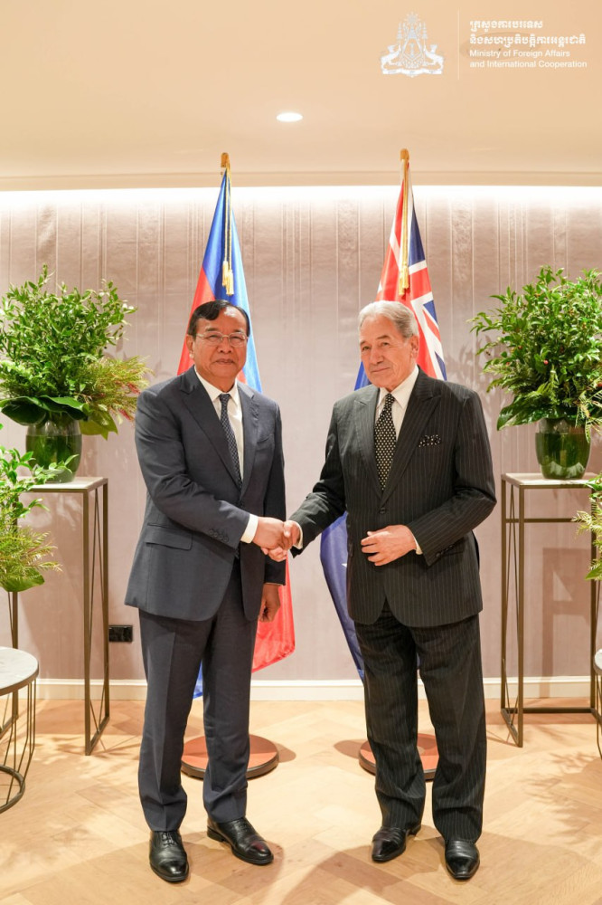 According to the Ministry of Foreign Affairs and International Cooperation, during the visit, H.E. Prak Sokhonn attended a working breakfast and held a bilateral meeting with Rt. Hon. Winston Peters, where the two sides discussed ways to further enhance cooperation between the two countries and exchanged views on regional and global issues of mutual interest.