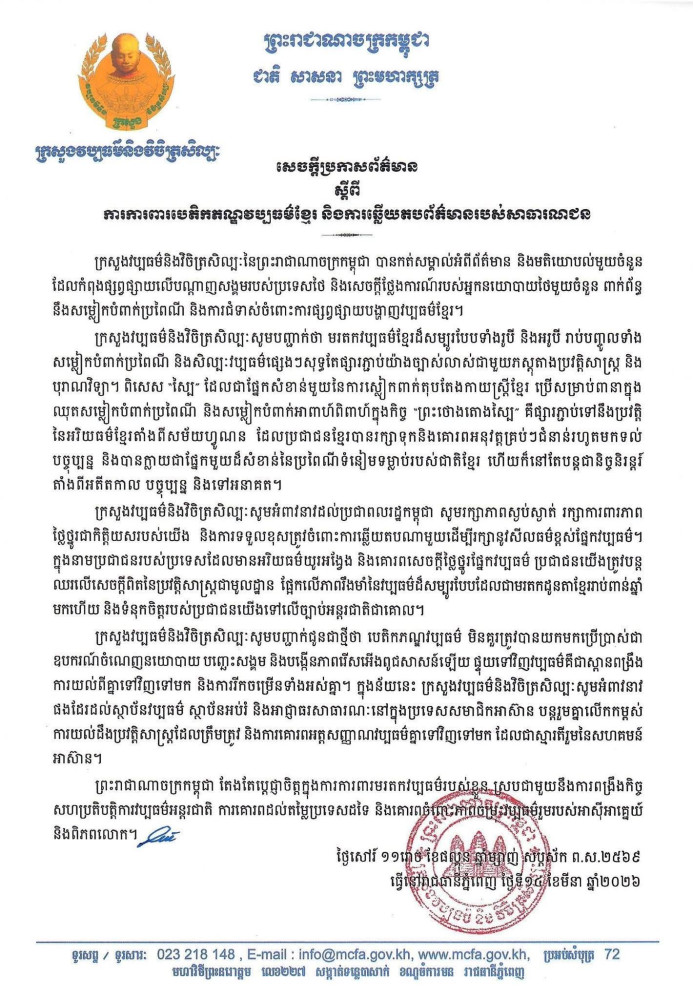The press release reaffirmed that Cambodia remains firmly committed to safeguarding its cultural heritage while strengthening international cultural cooperation, respecting the values of other nations, and promoting the shared cultural diversity of Southeast Asia and the wider world.