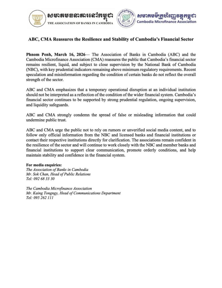 The Association of Banks in Cambodia (ABC) and the Cambodia Microfinance Association (CMA) on Monday issued a statement reassuring the resilience and stability of Cambodia's financial sector.
