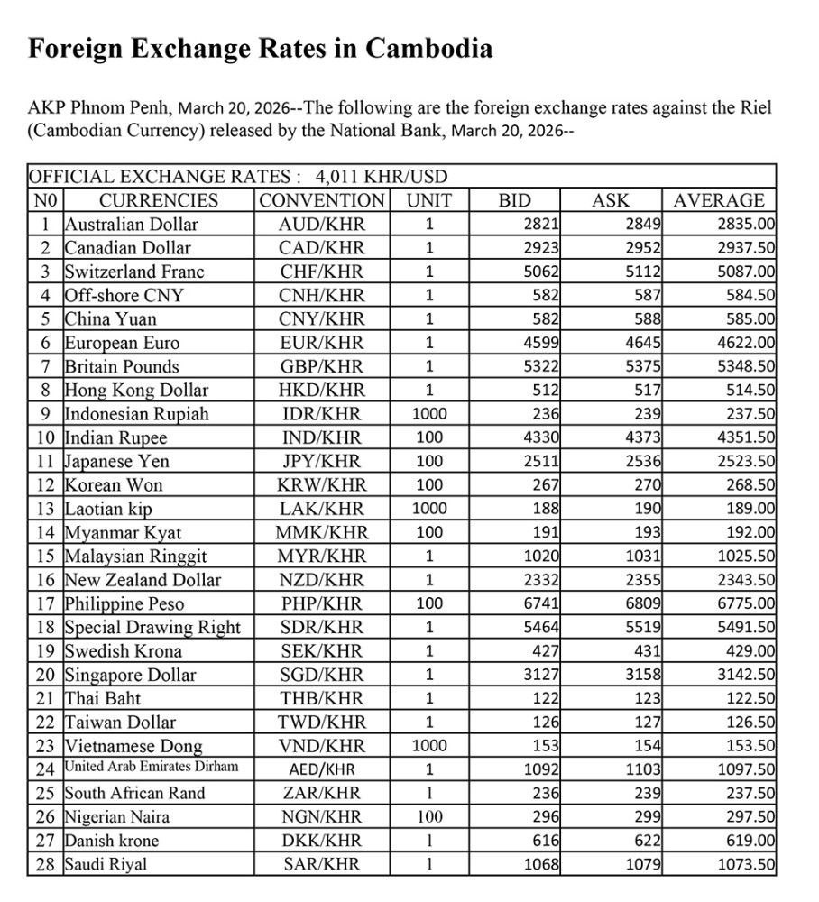 AKP Phnom Penh, March 20, 2026--The following are the foreign exchange rates against the Riel (Cambodian Currency) released by the National Bank, March 20, 2026--