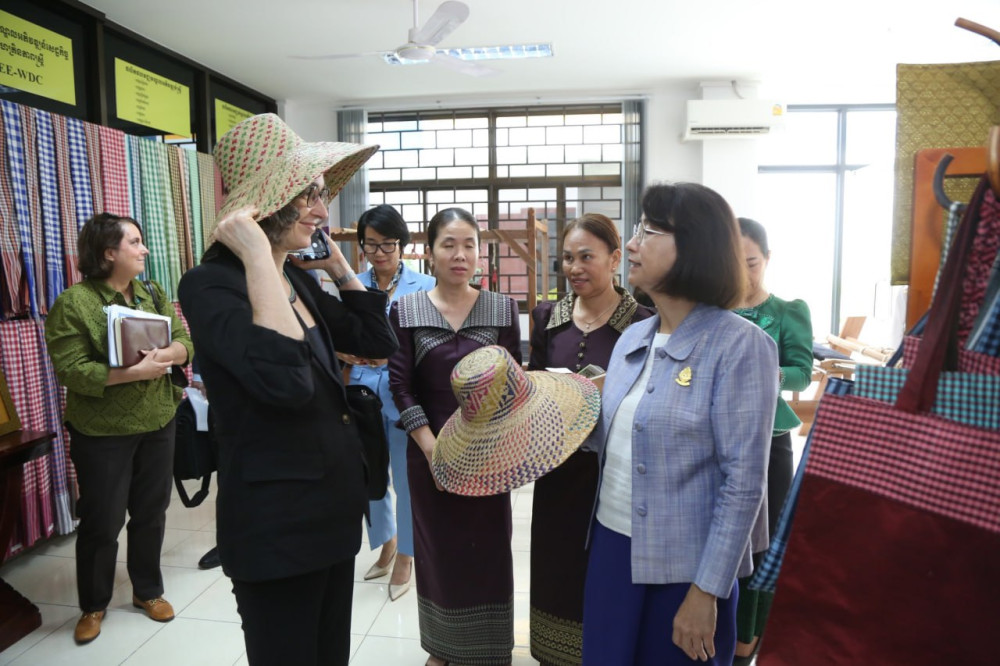 The visit included viewing initiatives by provincial women's development centres, the CPMEC Mart of the Cambodia Chamber of Commerce and Micro Enterprises, the WEE Market Hub, and the offices of the Cambodian Women Entrepreneurs Association (CWEA).