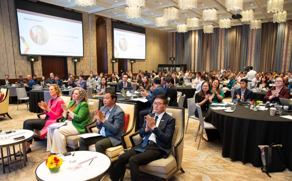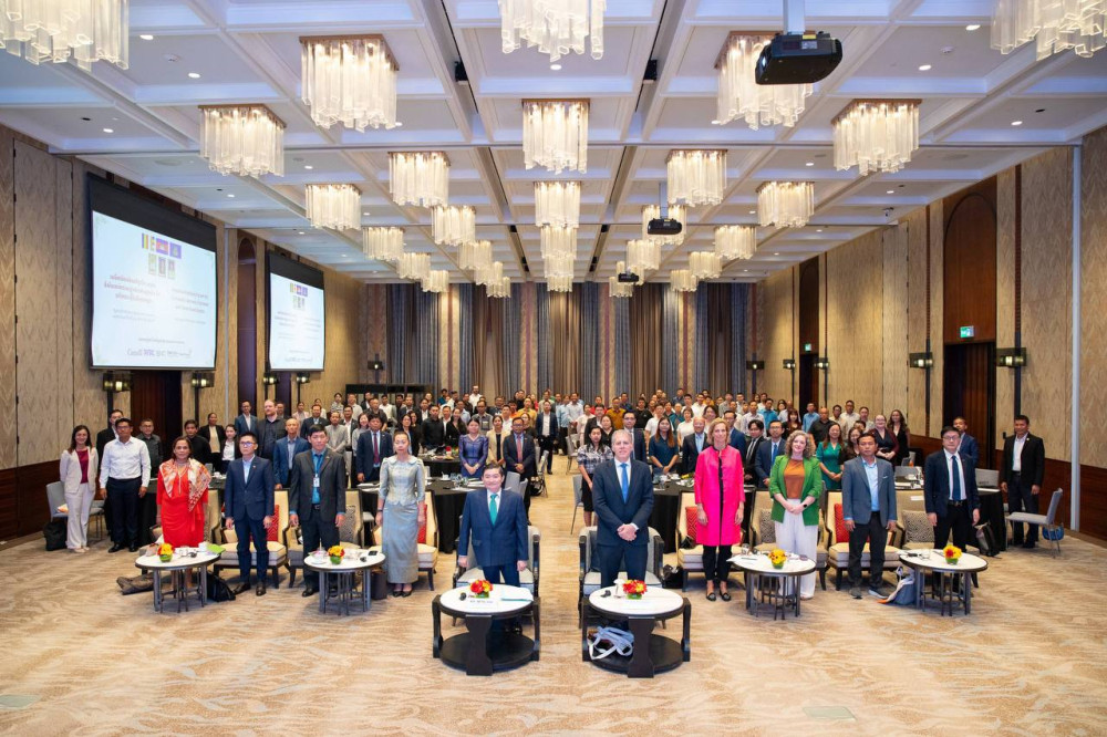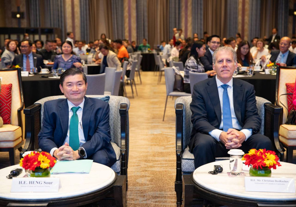 H.E. Heng Sour (Pic. 1), Minister of Labour and Vocational Training, delivers his opening remarks at the Forum for the Garment, Footwear and Travel Goods (GFT) Sector in Cambodia, held at the Hyatt Regency Hotel, Phnom Penh this morning, with the participation of H.E. Christian DesRoches, Ambassador of Canada to Cambodia, and Ms. Froukje Boele, Project Manager of ILO-BFC.