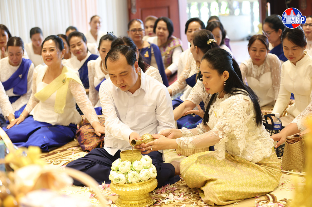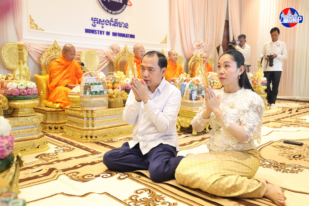 H.E. Neth Pheaktra (L, Pic. 1), Minister of Information, and his spouse Lok Chumteav Tuy Serey Ratanak Neth Pheaktra, Honorary President of the Cambodian Women for Peace and Development Association at the Ministry of Information, light candles while they were presiding over a blessing ceremony held at the Ministry this afternoon ahead of the Khmer Traditional New Year 2026 to pray for happiness, prosperity, and good fortune.
