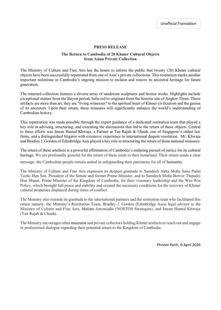 AKP Phnom Penh, April 07, 2026 -- Cambodia has successfully repatriated 20 Khmer cultural objects from a private collection in Asia, marking another significant milestone in the country’s ongoing efforts to recover its cultural heritage.
