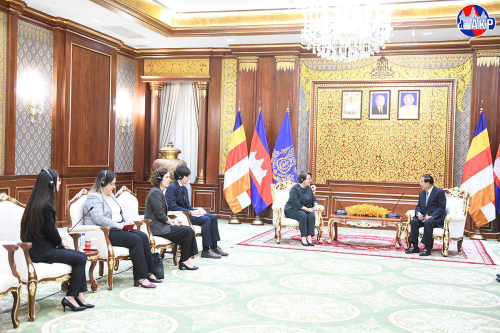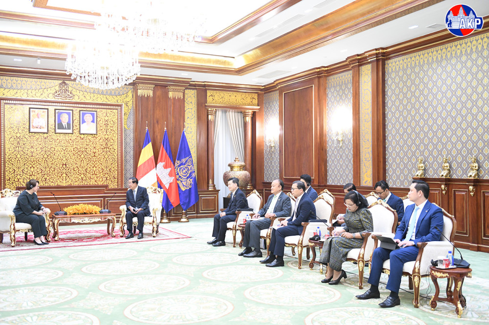 Samdech Akka Moha Sena Padei Techo Hun Sen (R, Pic. 1), Acting Head of State of the Kingdom of Cambodia, greets outgoing Turkish Ambassador to Cambodia, H.E. Ms. Ülkü Kocaefe, prior to their farewell meeting at the Senate's Solidarity Palace in Phnom Penh this morning.